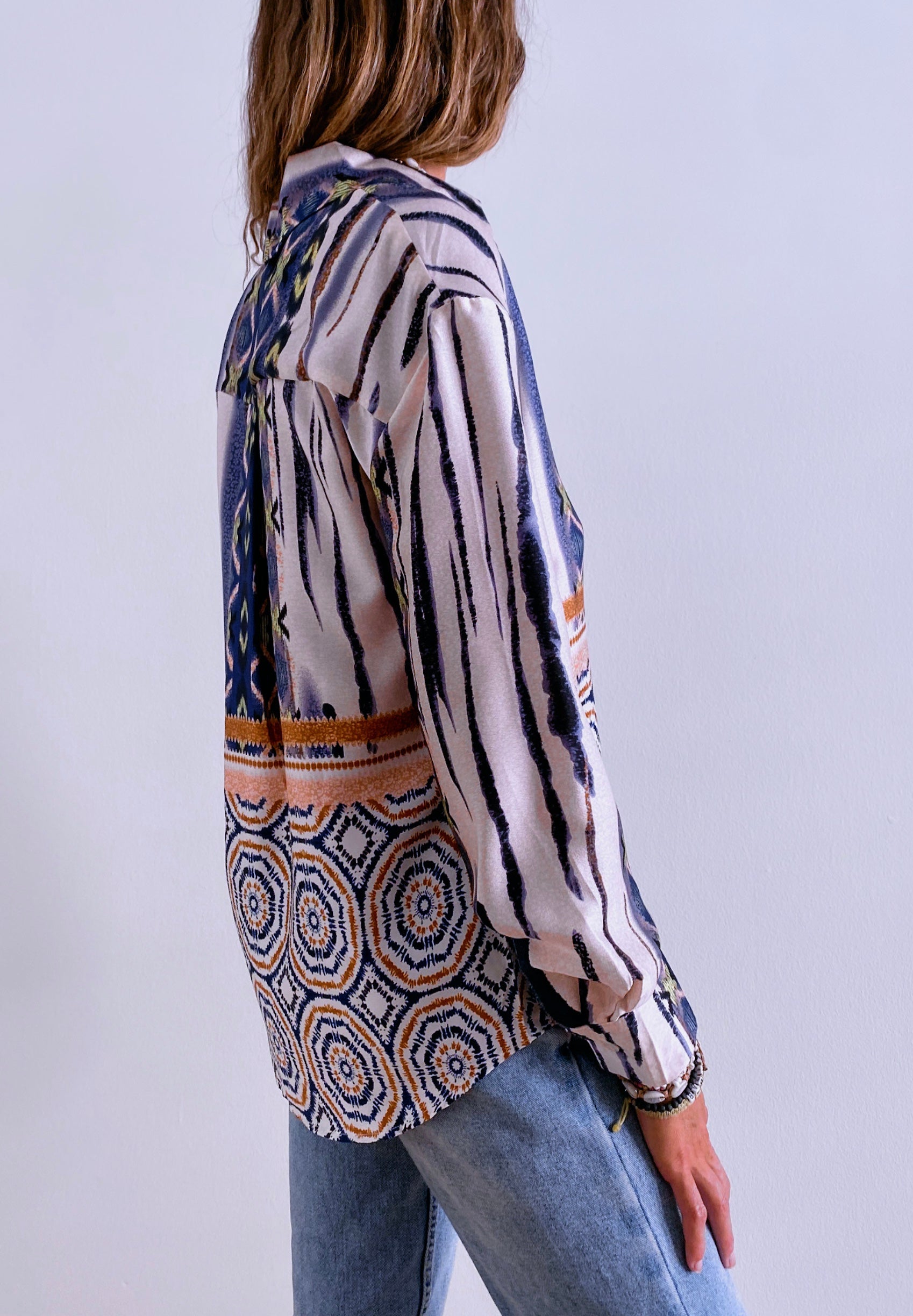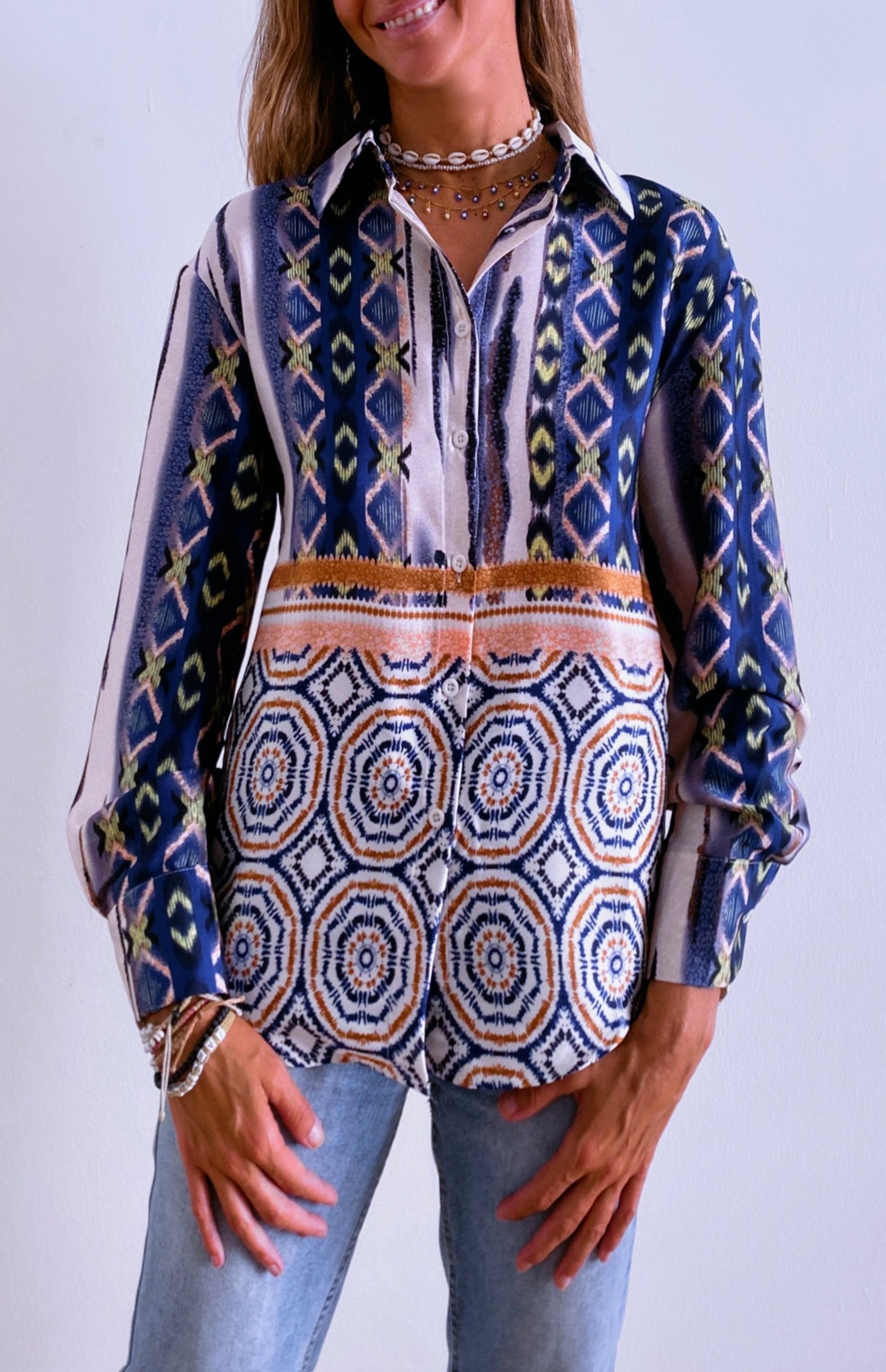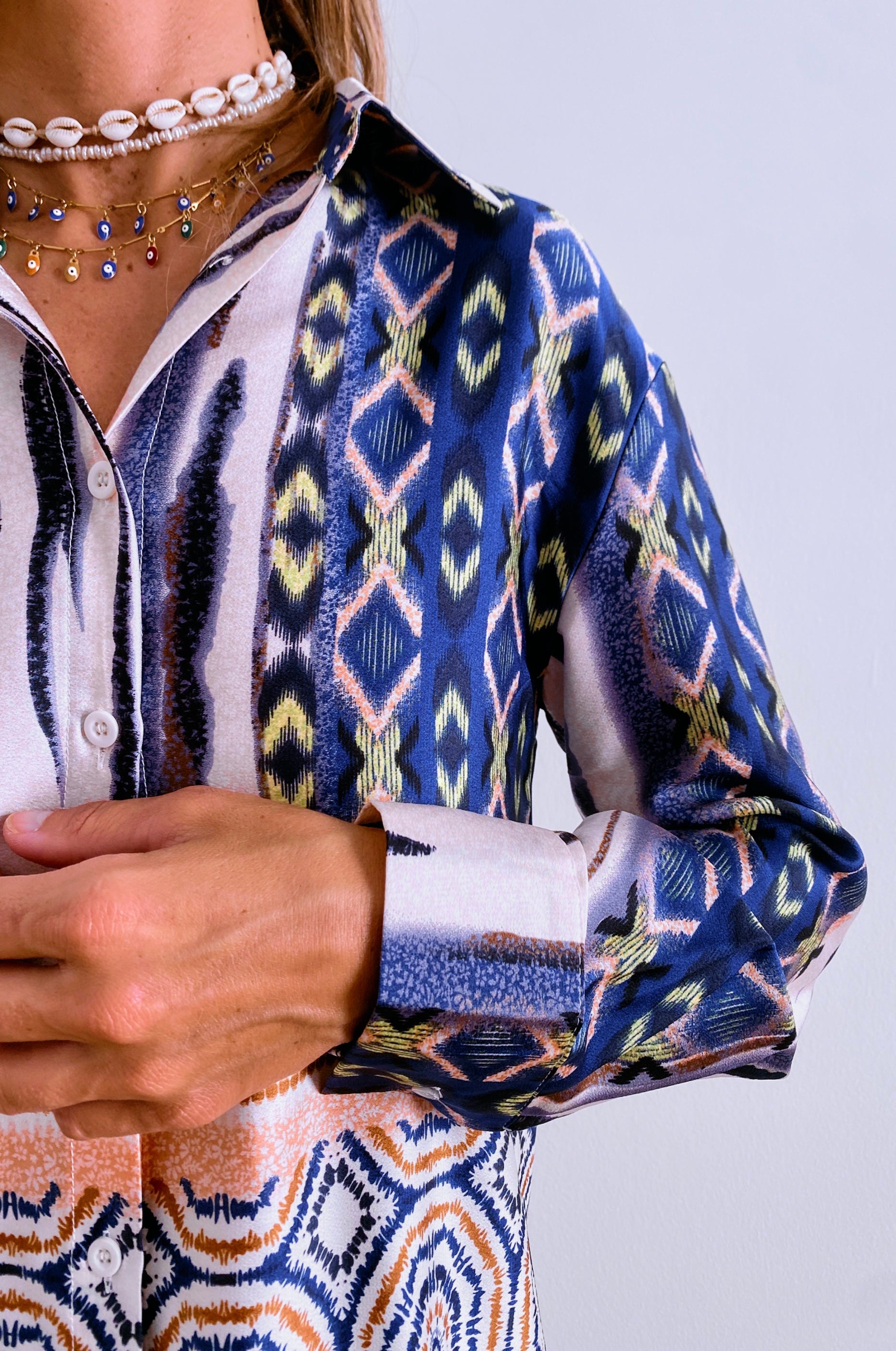 Our Albertine shirt feature soft quality raso polyester fabric with a silk-like hand feel and shine while bold patterns in deep blue, green, and cream tones are perfectly balanced to make a statement without overwhelming. The relaxed fit ensures comfort while maintaining a chic silhouette, making it ideal for both casual and more refined looks. Wear it with its matching trousers for a striking ensemble, or style it separately with your favourite pair of jeans for a more casual, yet stylish ensemble.