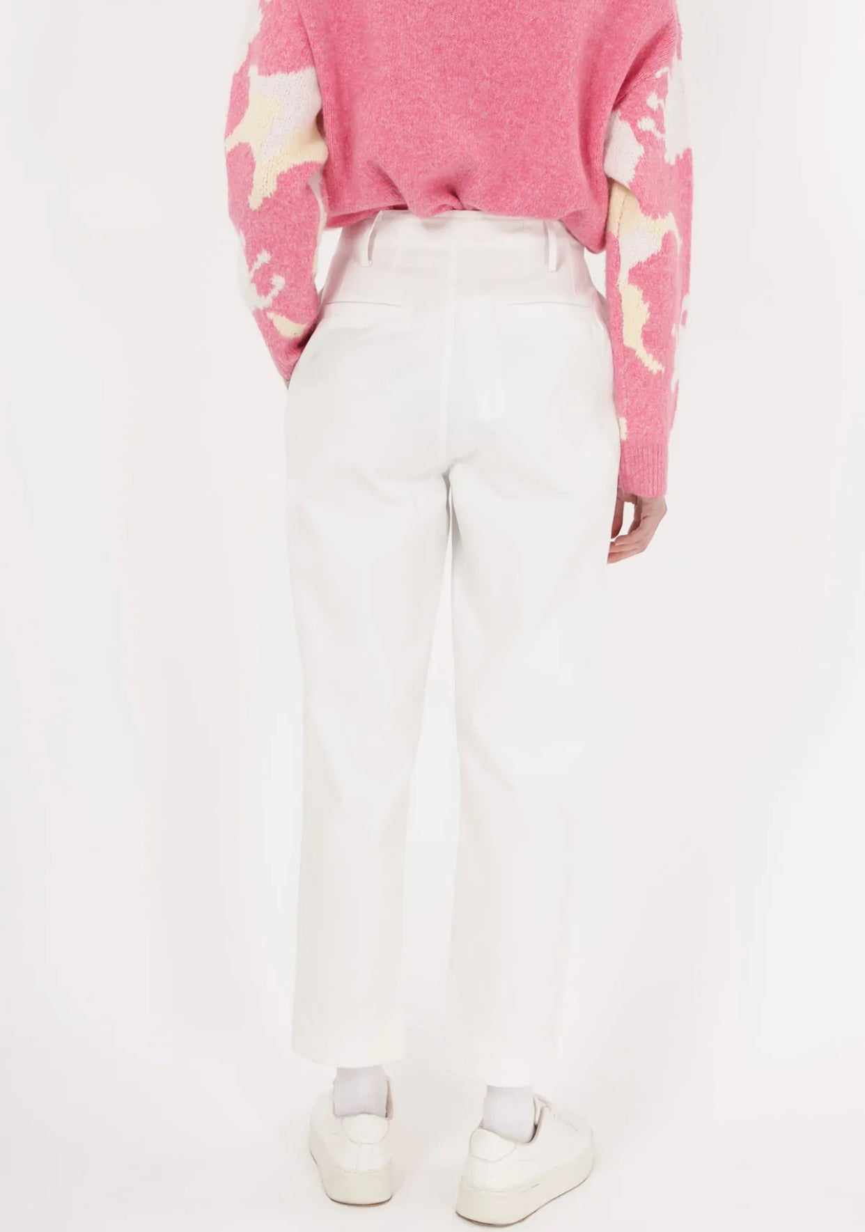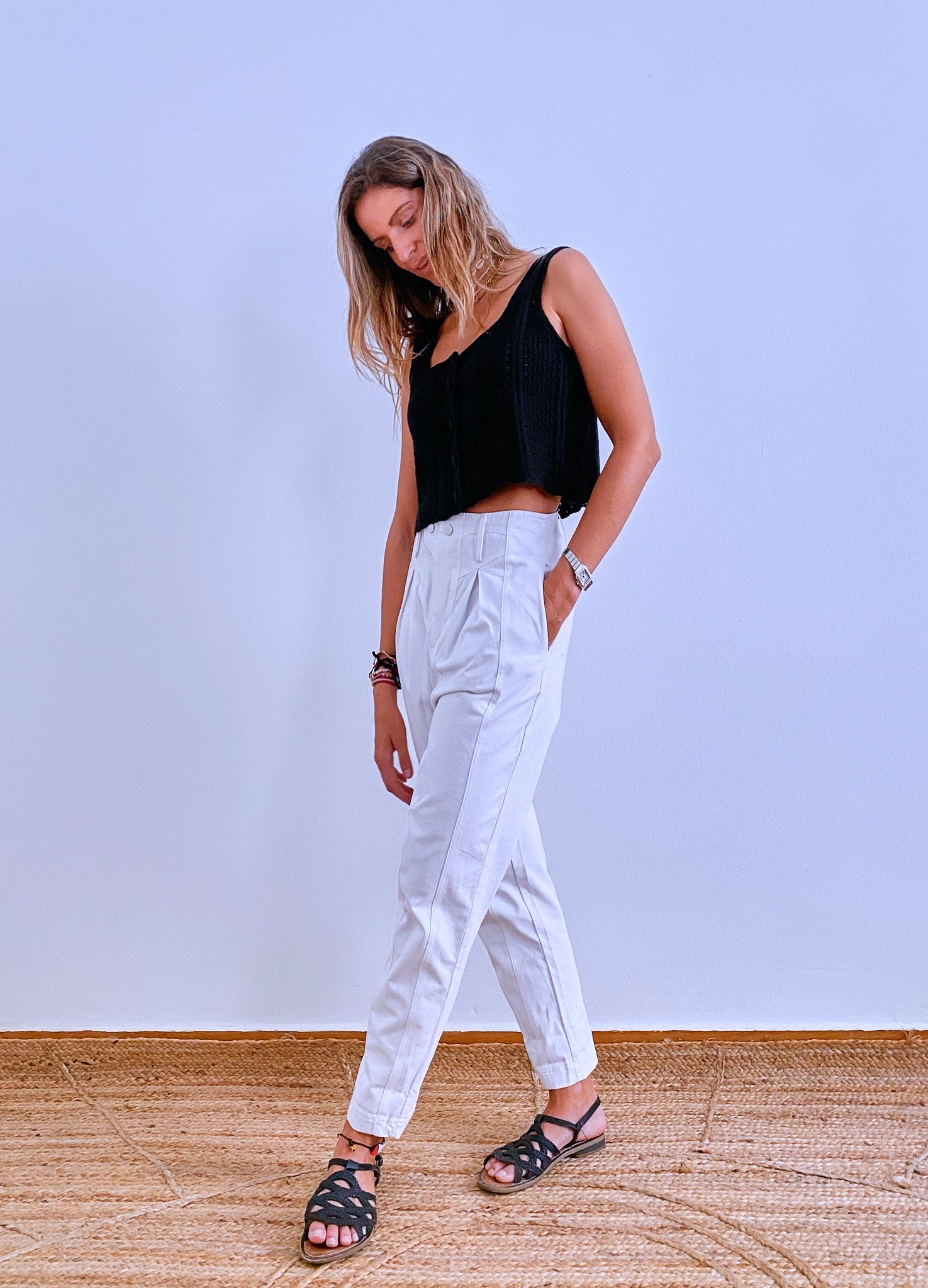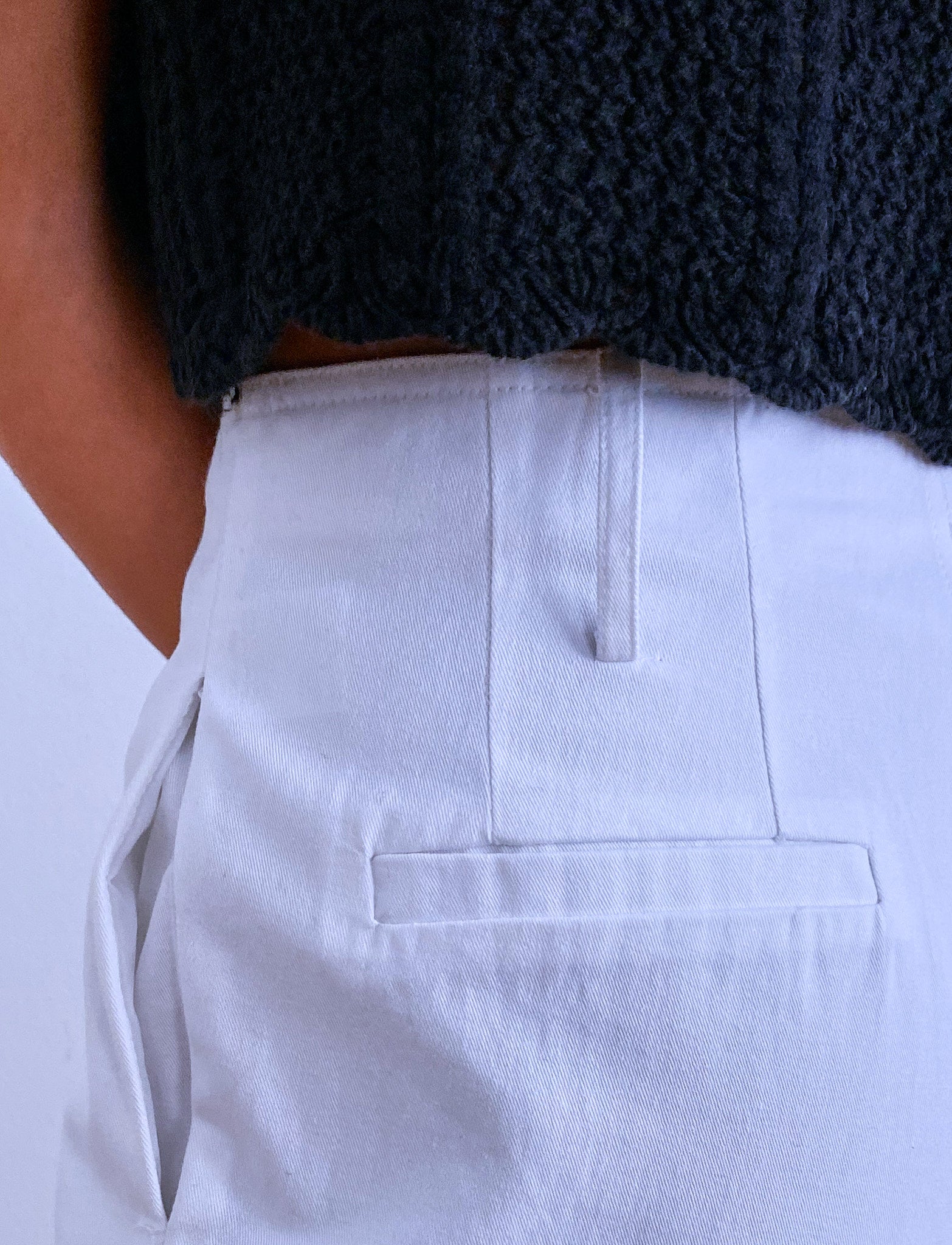 Sophistication and comfort. Our meticulously crafted Anne trousers, feature a high waist and tailored front darts for a refined silhouette. The integration of front metal snaps and two double welt pockets at the back achieves a harmonious fusion of sporty and classic elements.