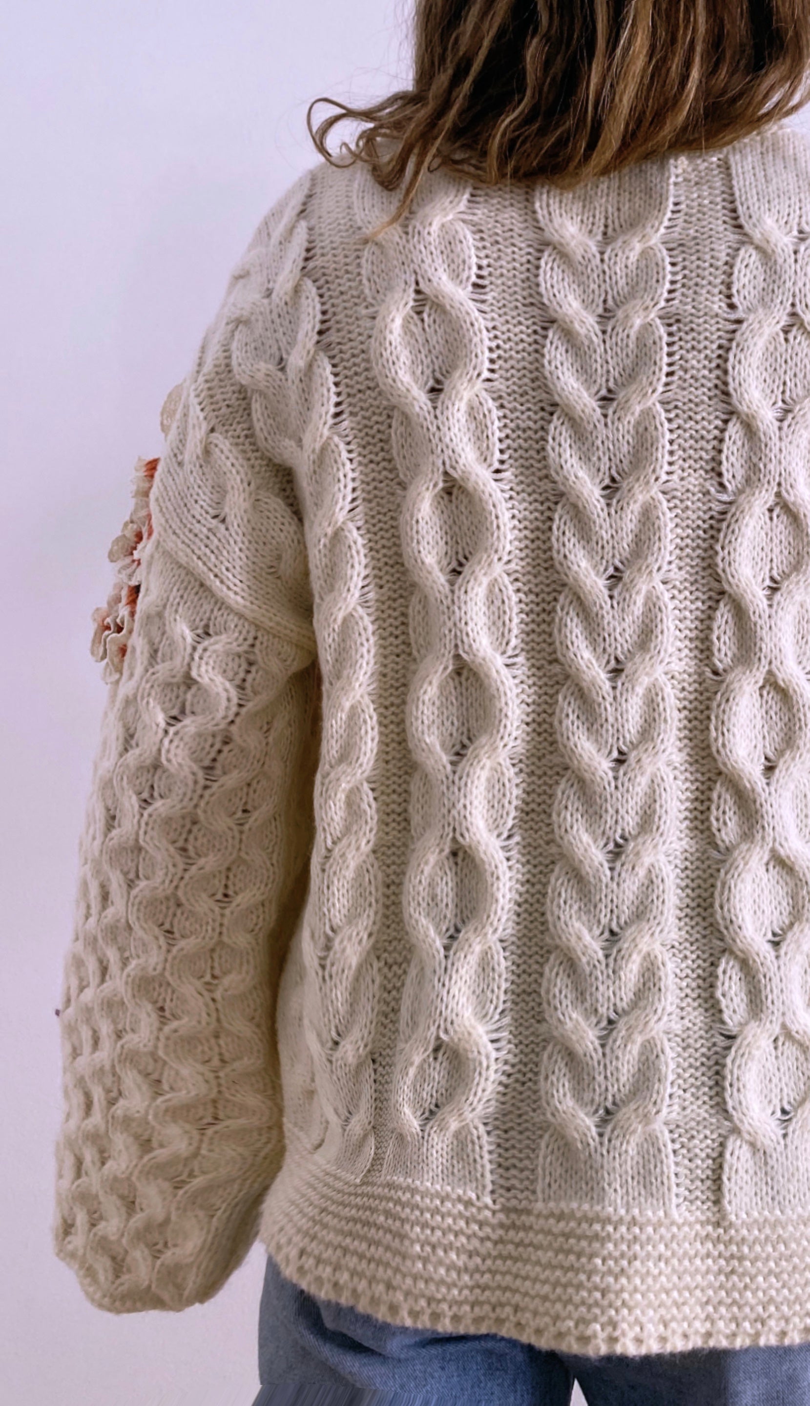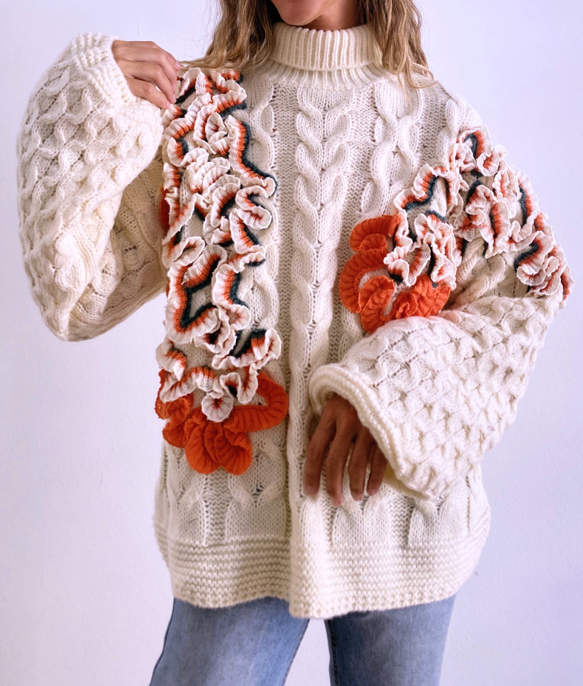Medium knit fabric / Turtle neck / Long sleeve / Knitted flowers design / Cable knit on the cuffs and neck / Straight design / Oversize fit