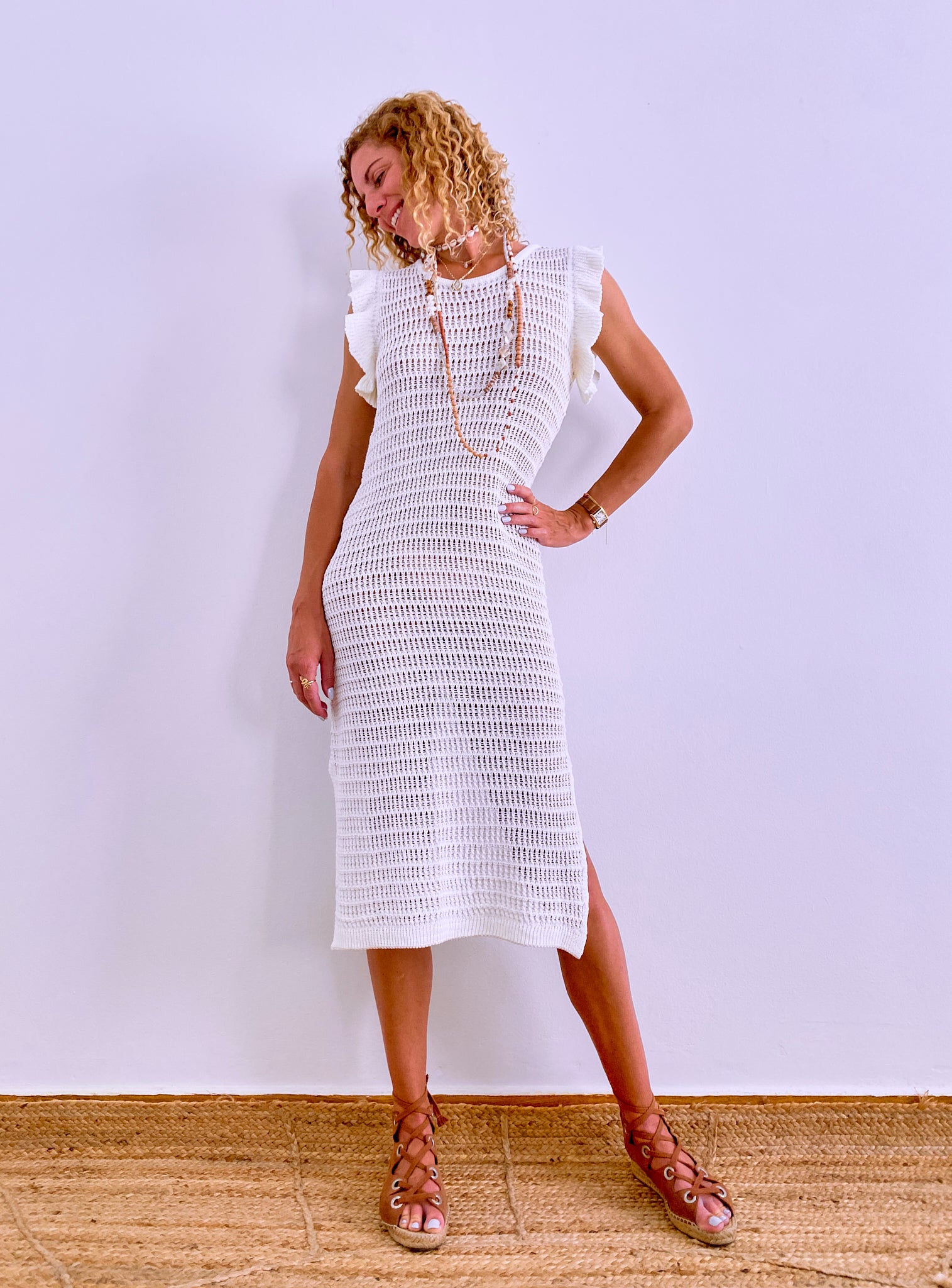 Open knit crochet dress / Round neckline / Sleeveless / Ruffled armholes / No lining / Midi dress / Loose fit