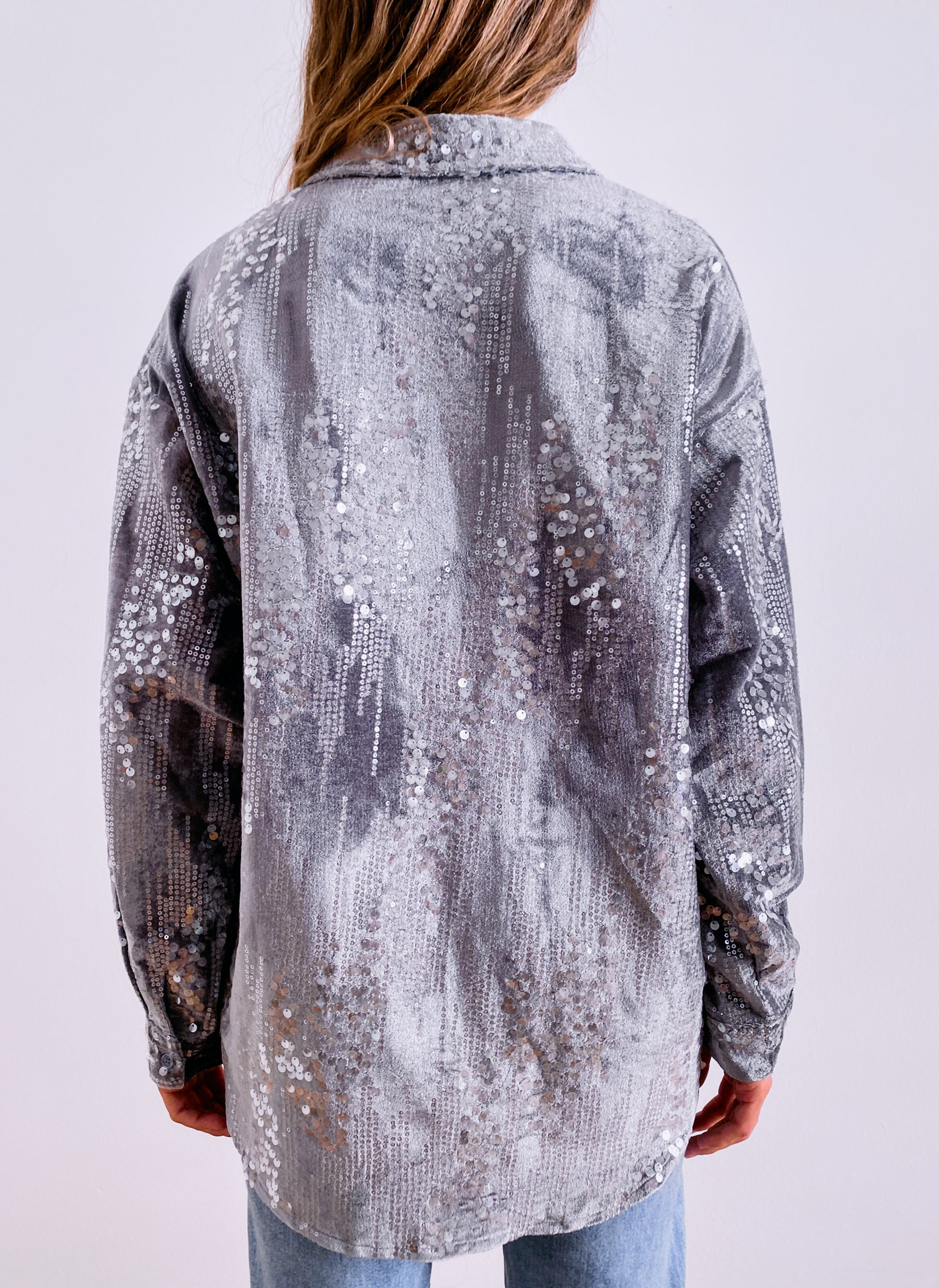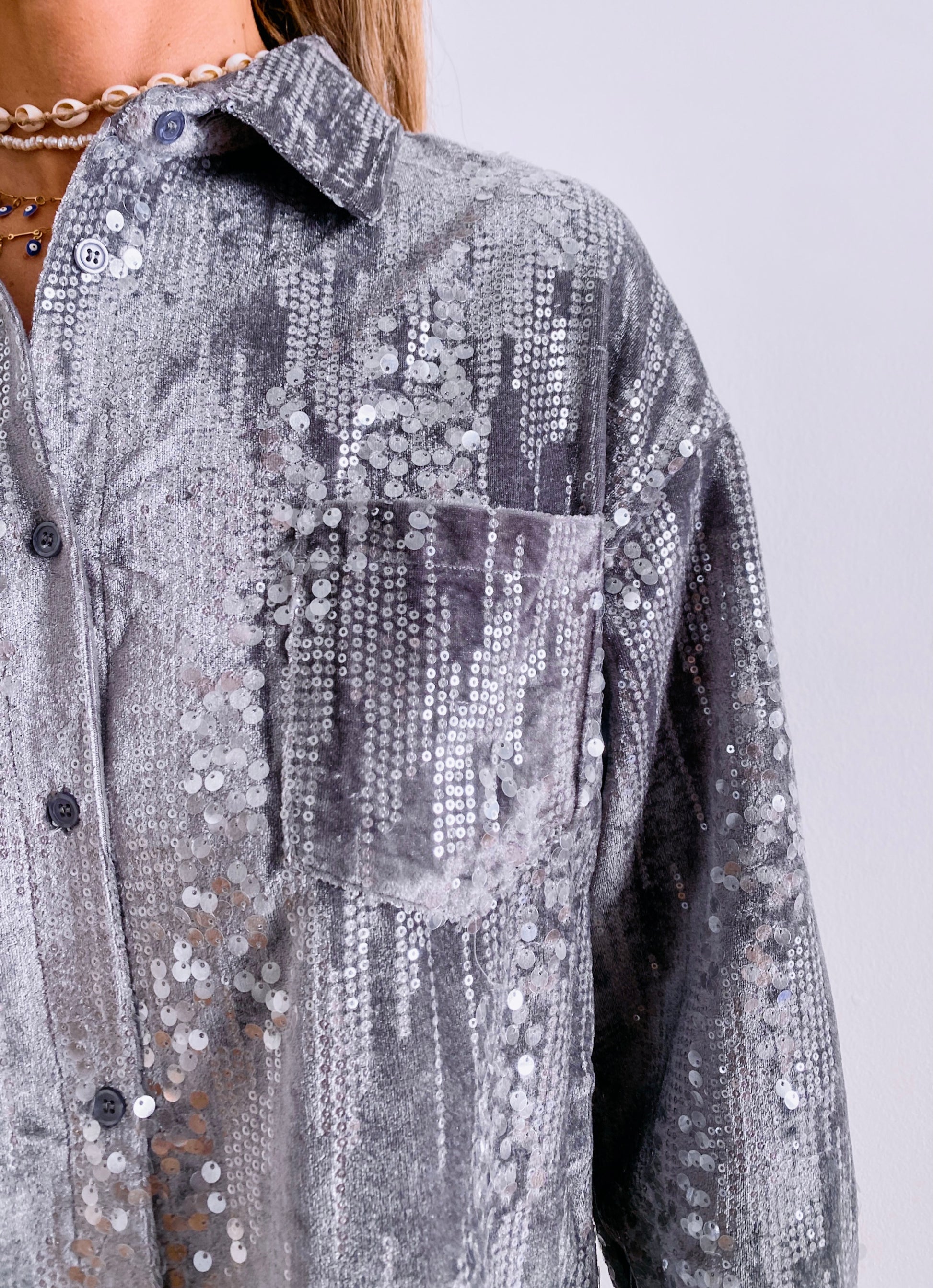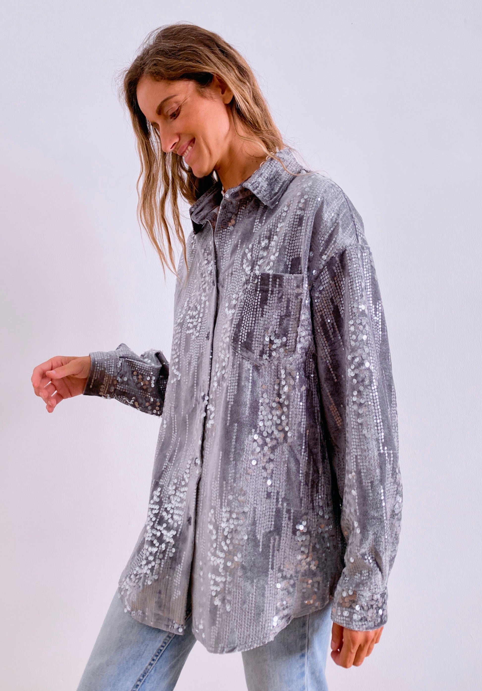 Velvet fabric / Long sleeves shirt / Classic collar / Front panel fastening buttons / Buttoned cuffs / Patch pocket on the chest / Straight fit / Handmade sequins embellishment / Oversize fit / Co-ord