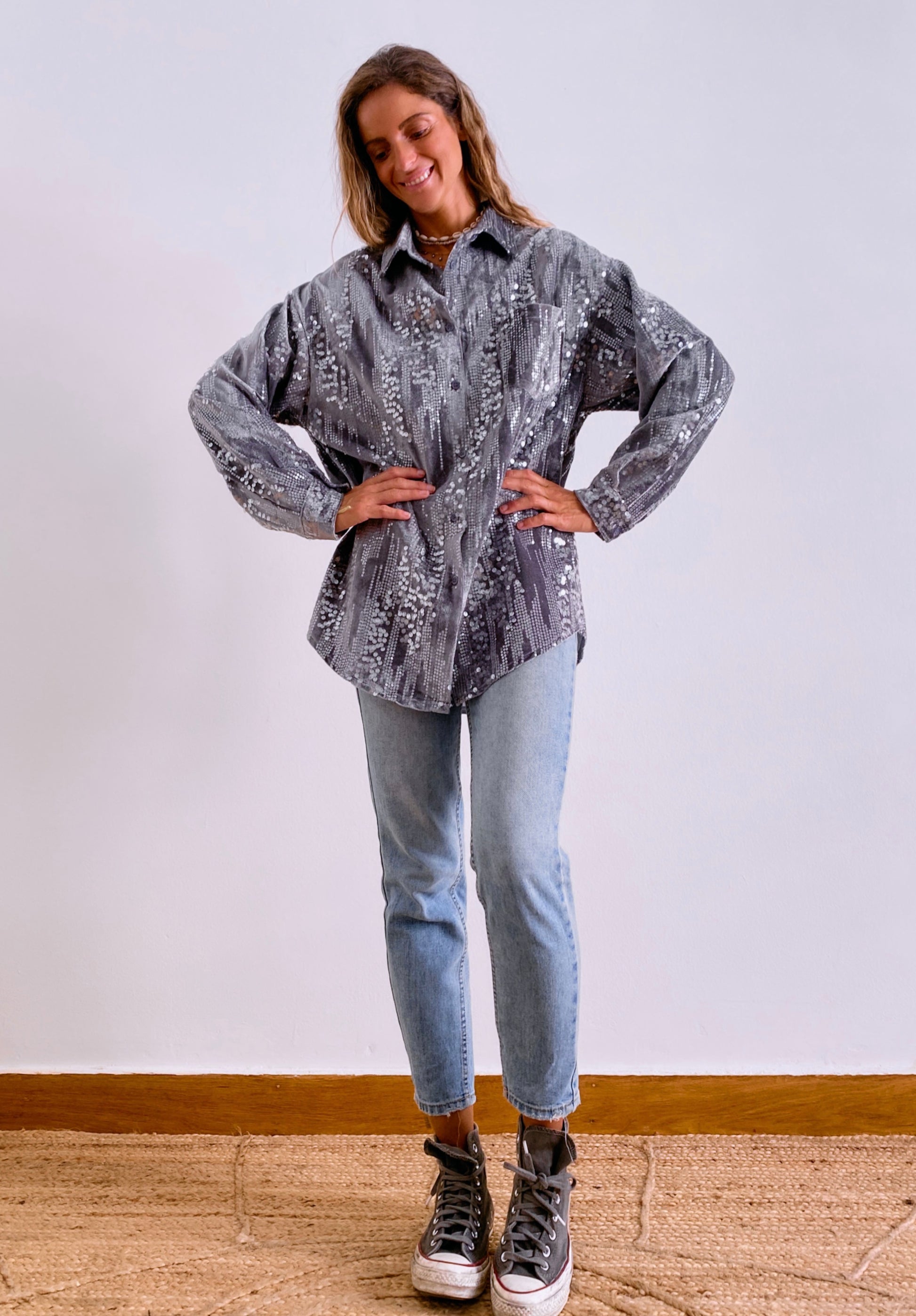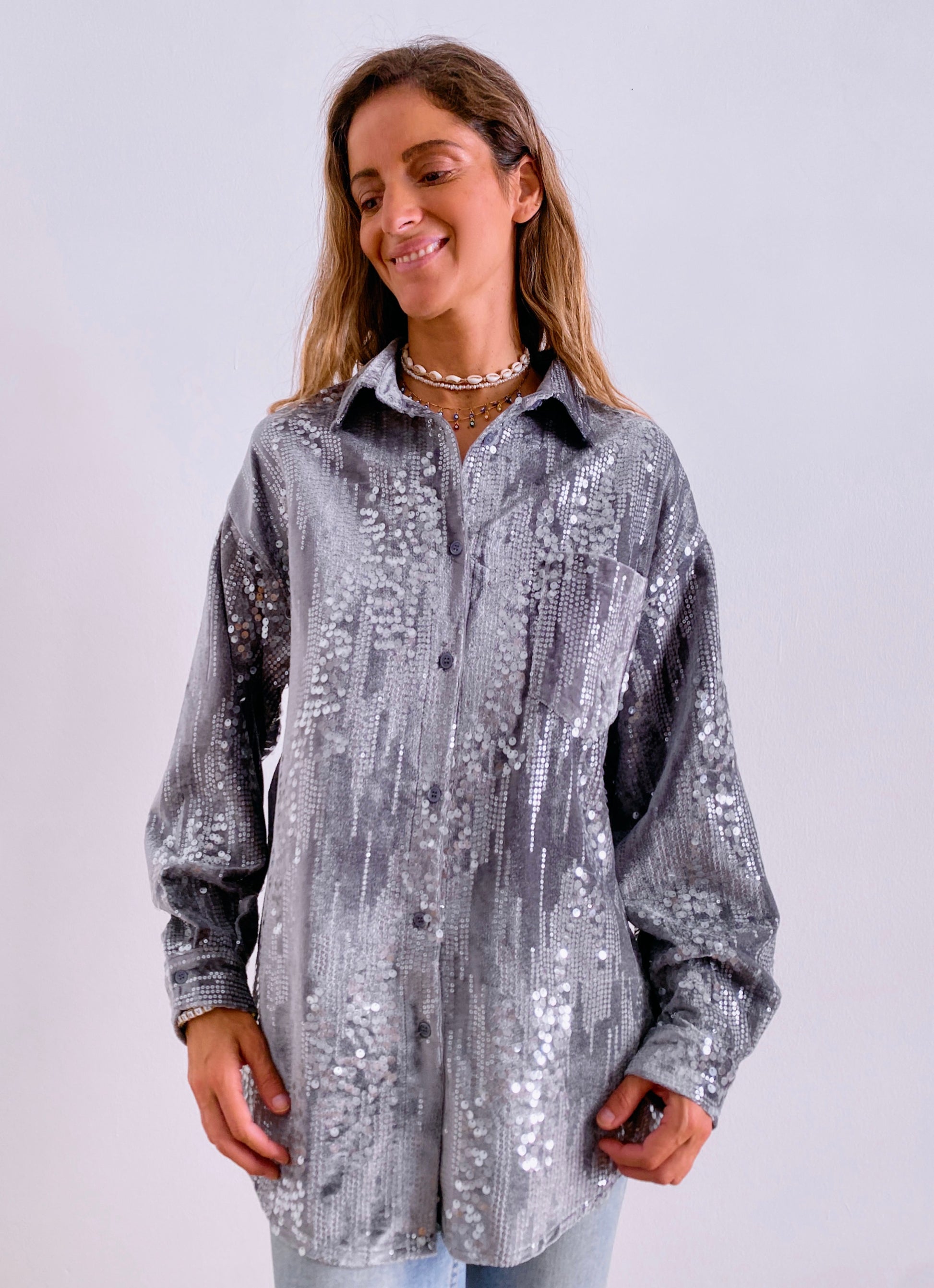 Our Charlotte velvet shirt exudes a festive and glamorous vibe, thanks to the tone-to-tone sequins carefully sewn across its surface. The oversized, loose fit ensures a trendy, relaxed silhouette, perfect for staying comfortable while looking chic. The luxurious velvet fabric adds warmth, making it an ideal choice for the winter season, while the shimmering sequins bring a bold, eye-catching touch, perfect for the holiday festivities. Pair it with the matching trousers for a complete statement look or style it separately with jeans for a more casual yet sophisticated outfit.