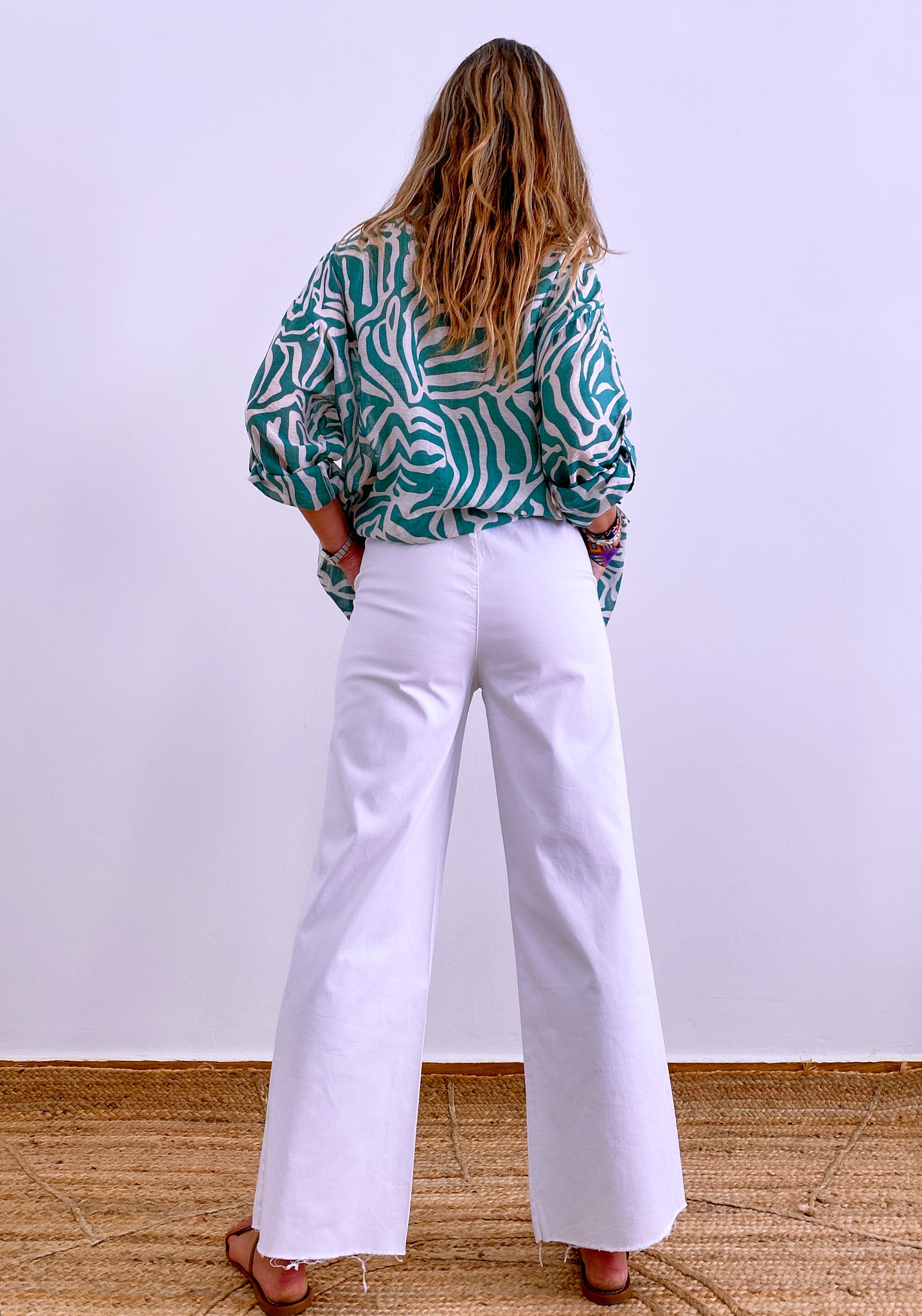 High waist / Side pockets / Adjustable cotton cord / Elastic waistband / Seamless hem / Straight wide leg