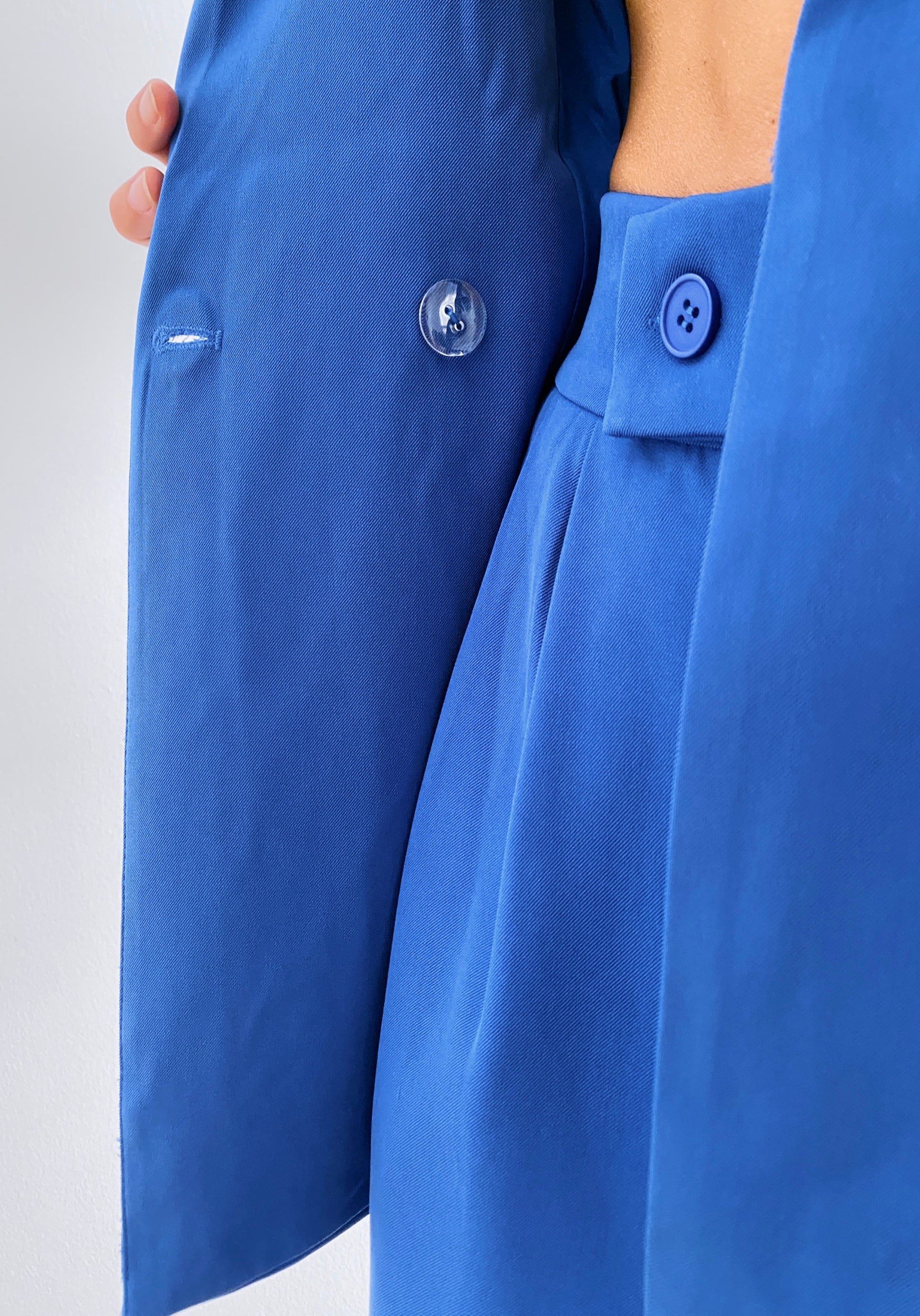 Classic silhouette / Lapel collar / Long sleeves / Double breasted button fastening at the front / Flap pockets / Soft fabric / Lining / Inner button for closure / Relaxed fit / Co-ord