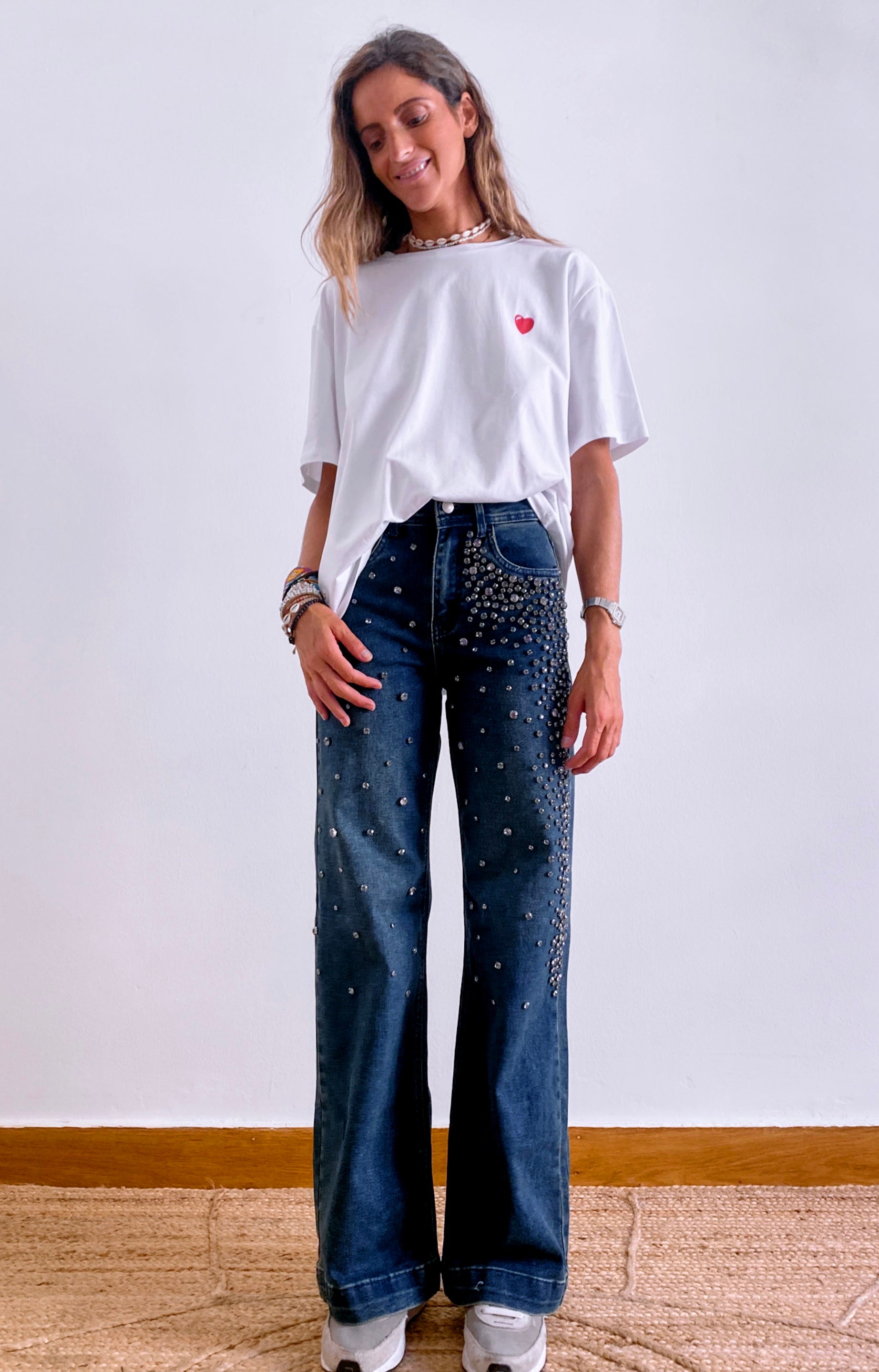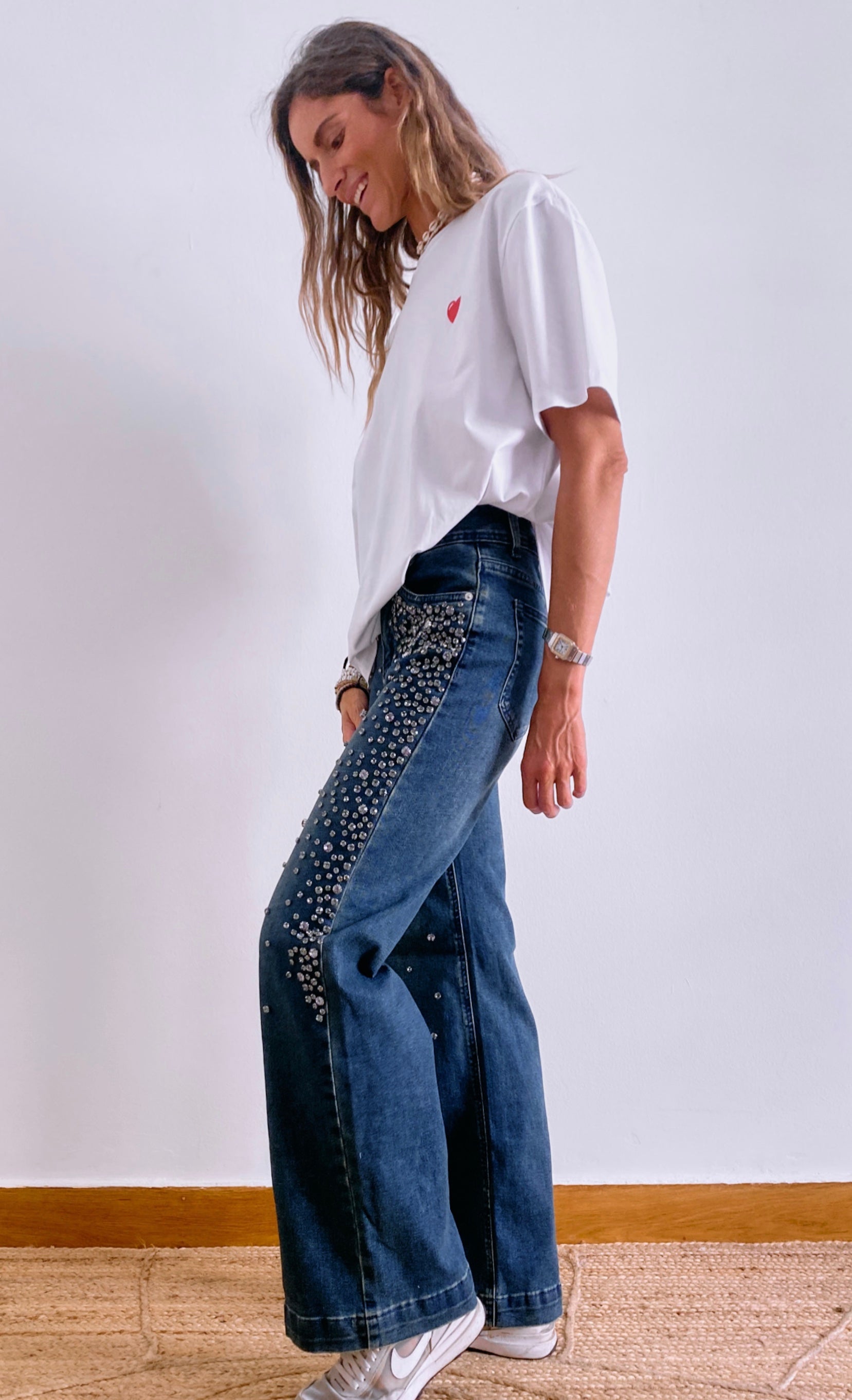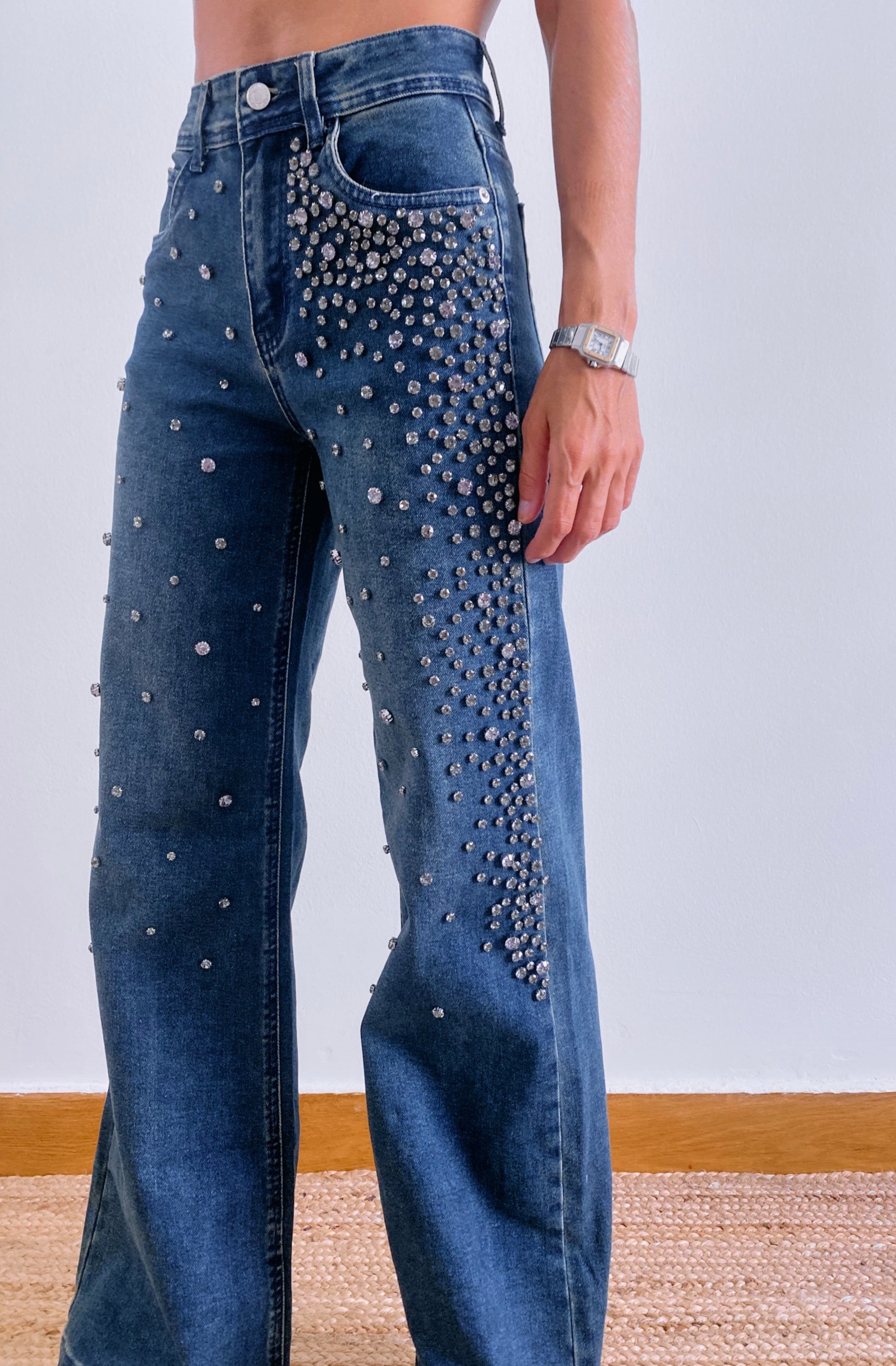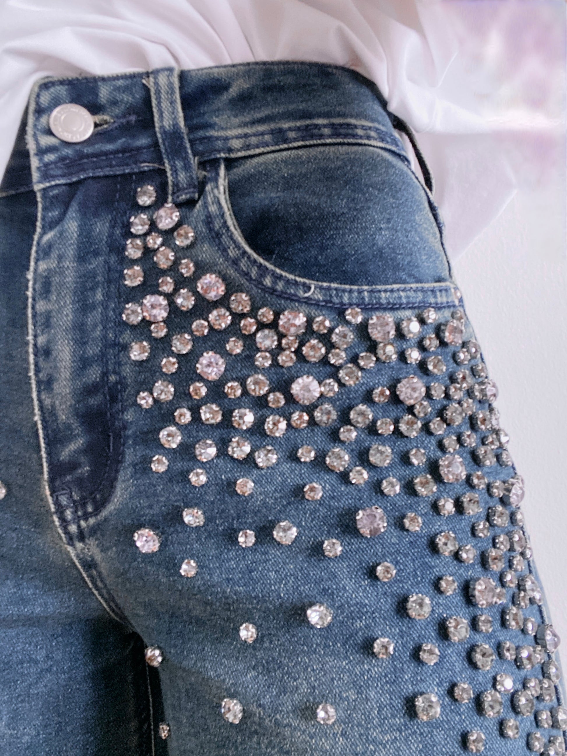 Our premium and limited edition Diane jeans feature stunning, hand-applied rhinestones, adding a touch of glamour and uniqueness to its classic denim look. With its perfect cut and its added elasticity, these jeans offer a flattering silhouette while keeping you on-trend for the coming season. Perfect for styling with a glamorous top for a night out or pairing with a basic t-shirt for an all-day casual look. These statement jeans combine boldness with versatility, making them a must-have piece for the season.