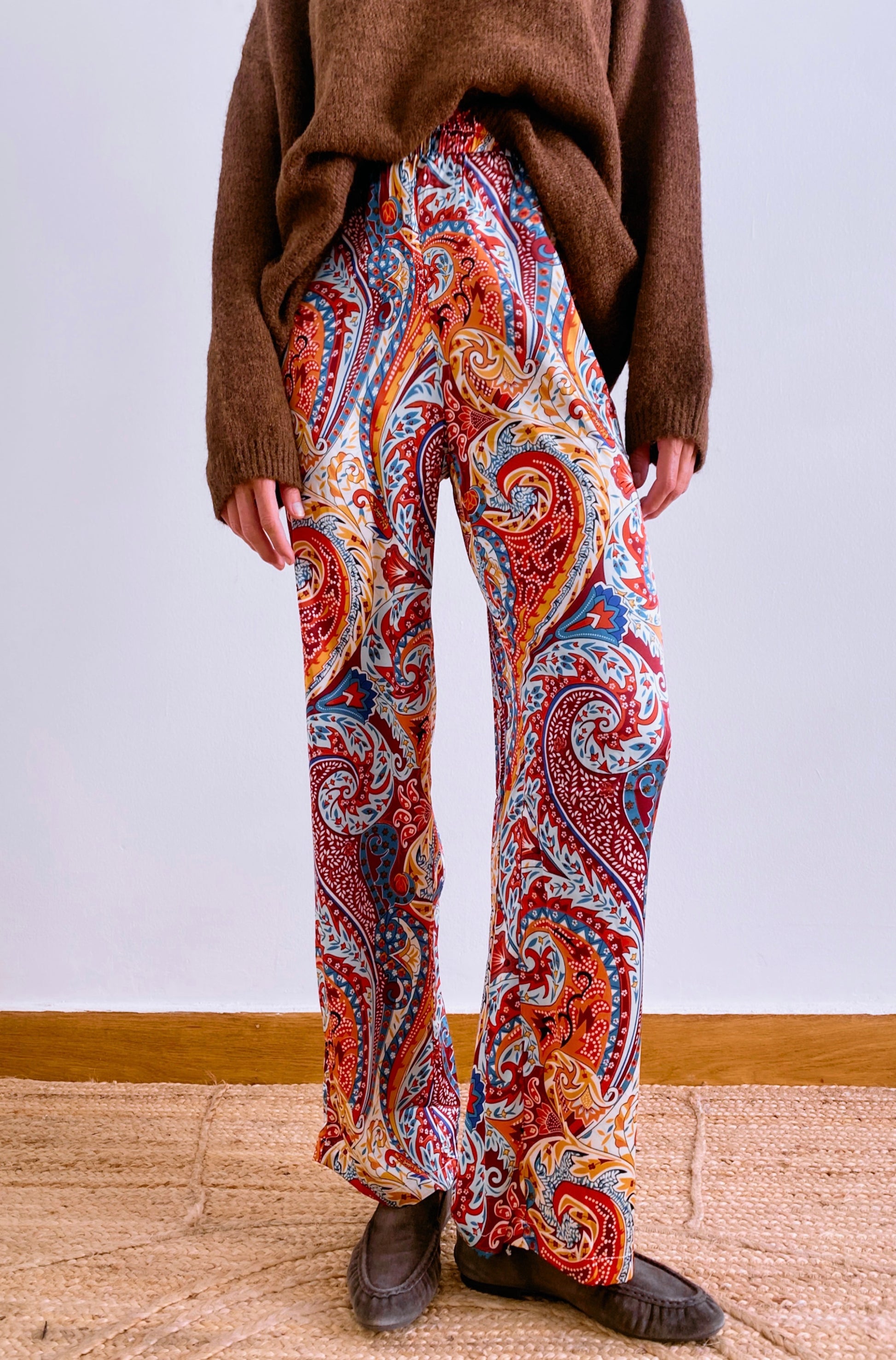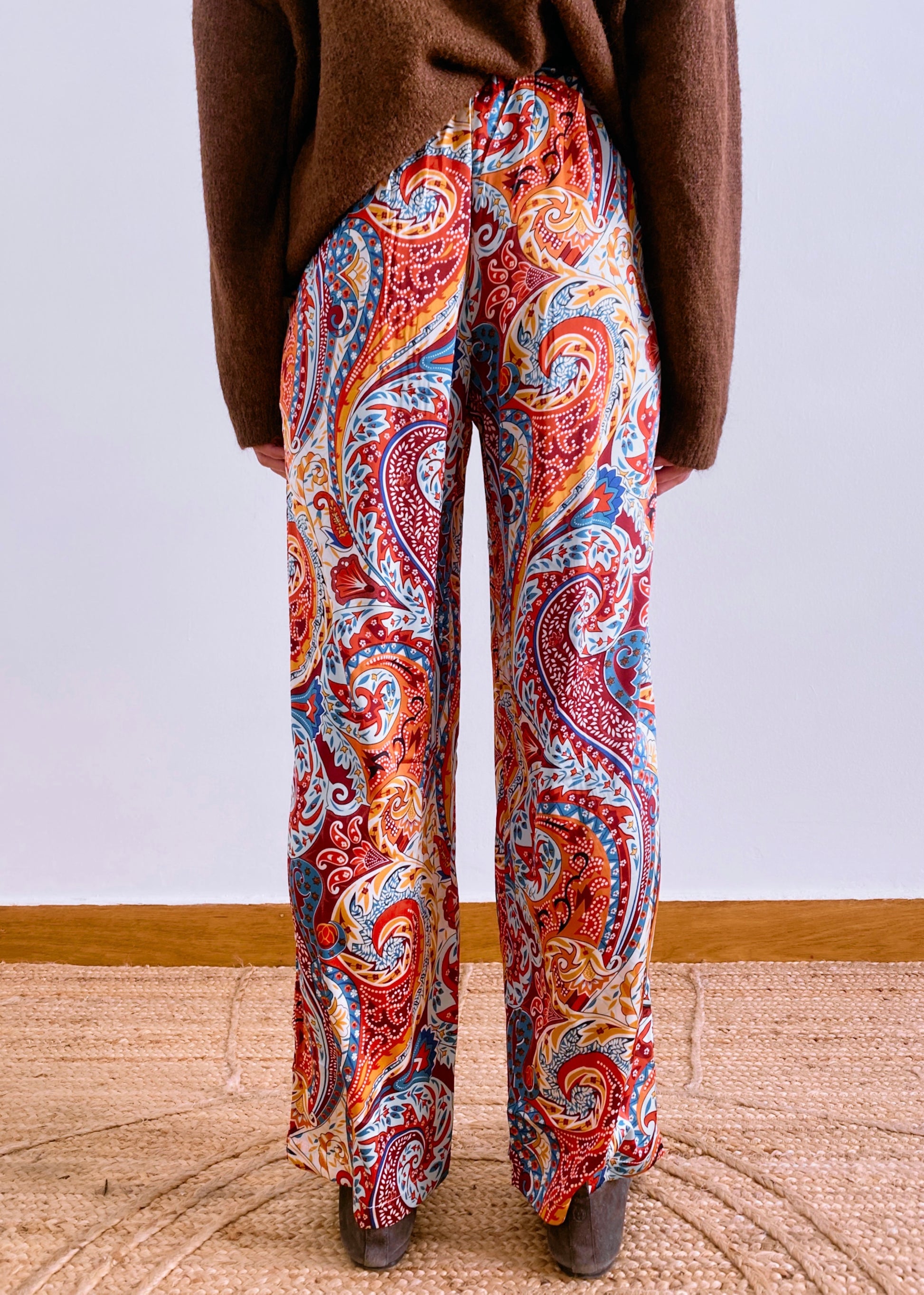 Our wide-leg Inés trousers feature soft premium quality raso polyester fabric with a luxurious silk-like hand feel with a gentle sheen, elevating their bold paisley print design. The relaxed fit ensures comfort while maintaining a chic silhouette, making them ideal for both casual and more refined looks. Wear them with the matching shirt for a striking ensemble, or style them separately with one colour tops to let the print take center stage.