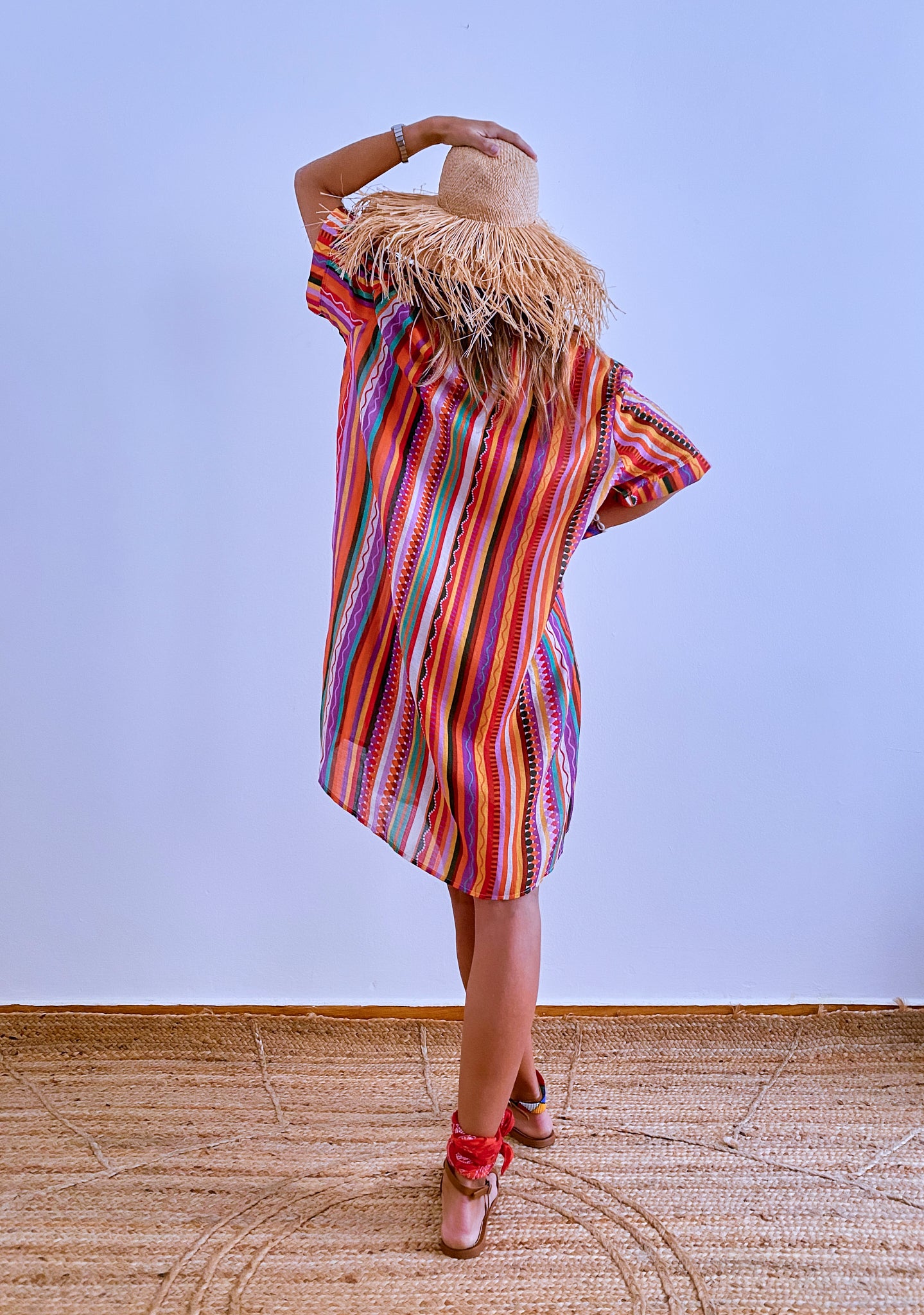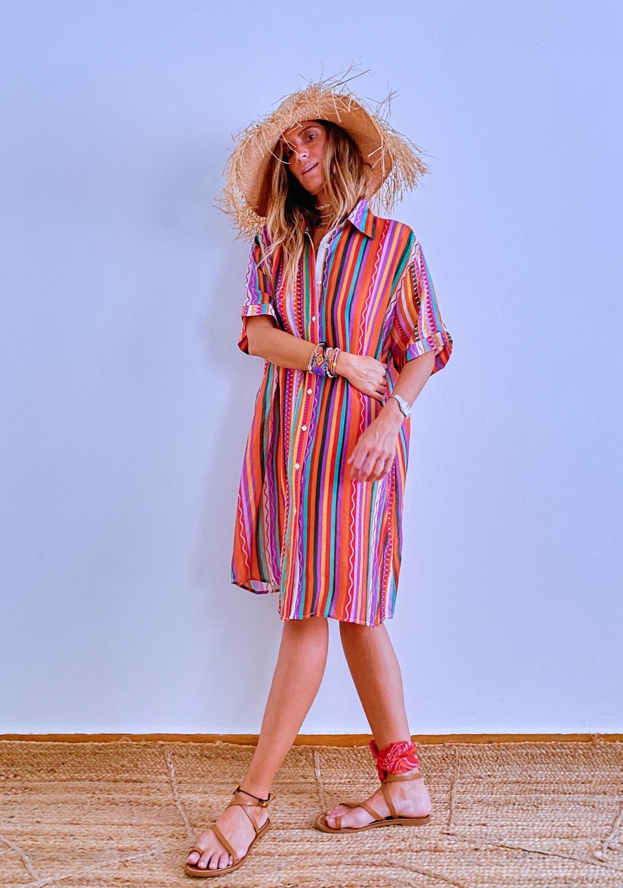 3/4 turn up sleeves / Classic collar / Mother of pearl buttons / Printed striped design / Shirt dress / Side slits / Cover up shirt / Relaxed fit
