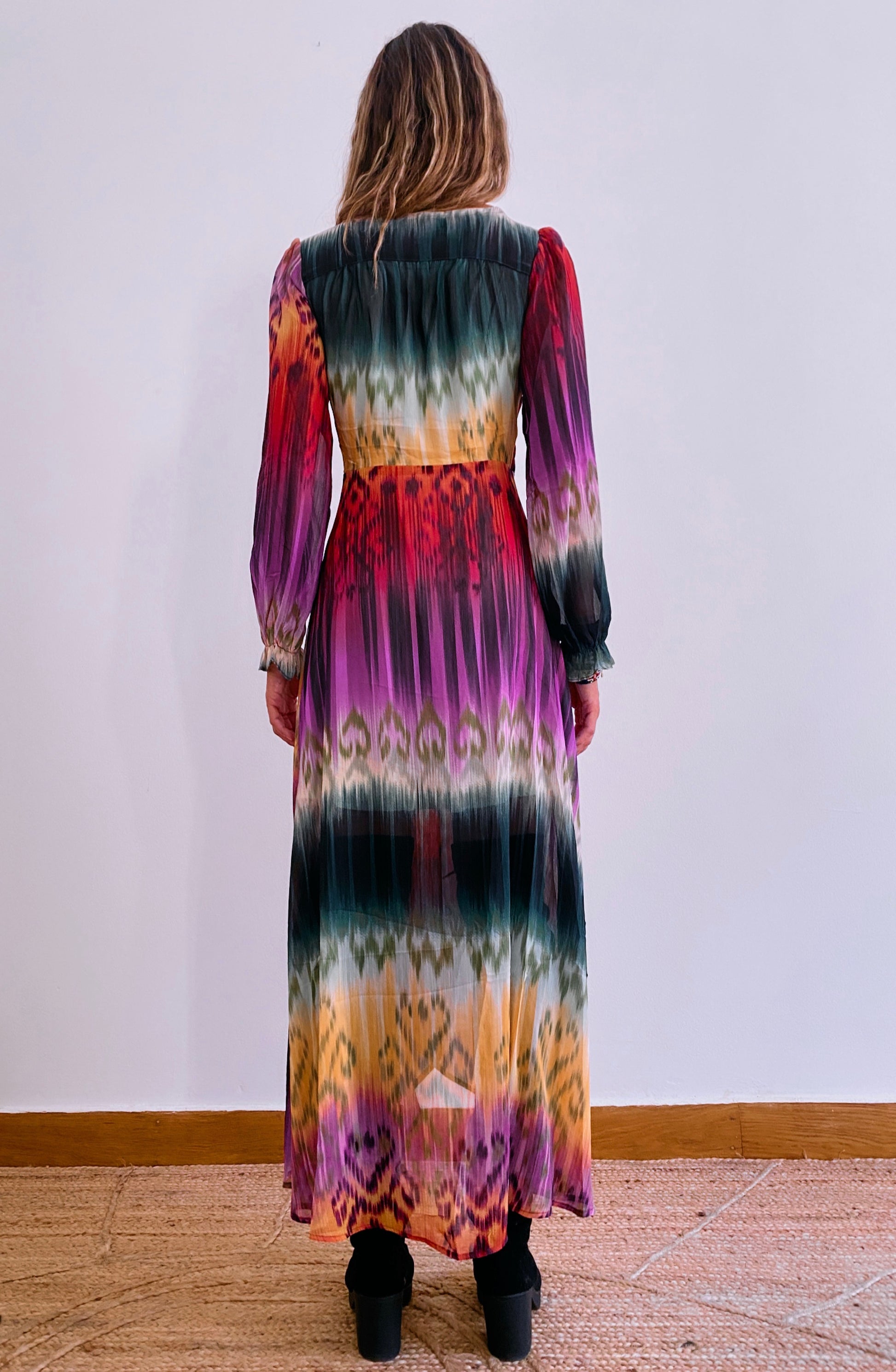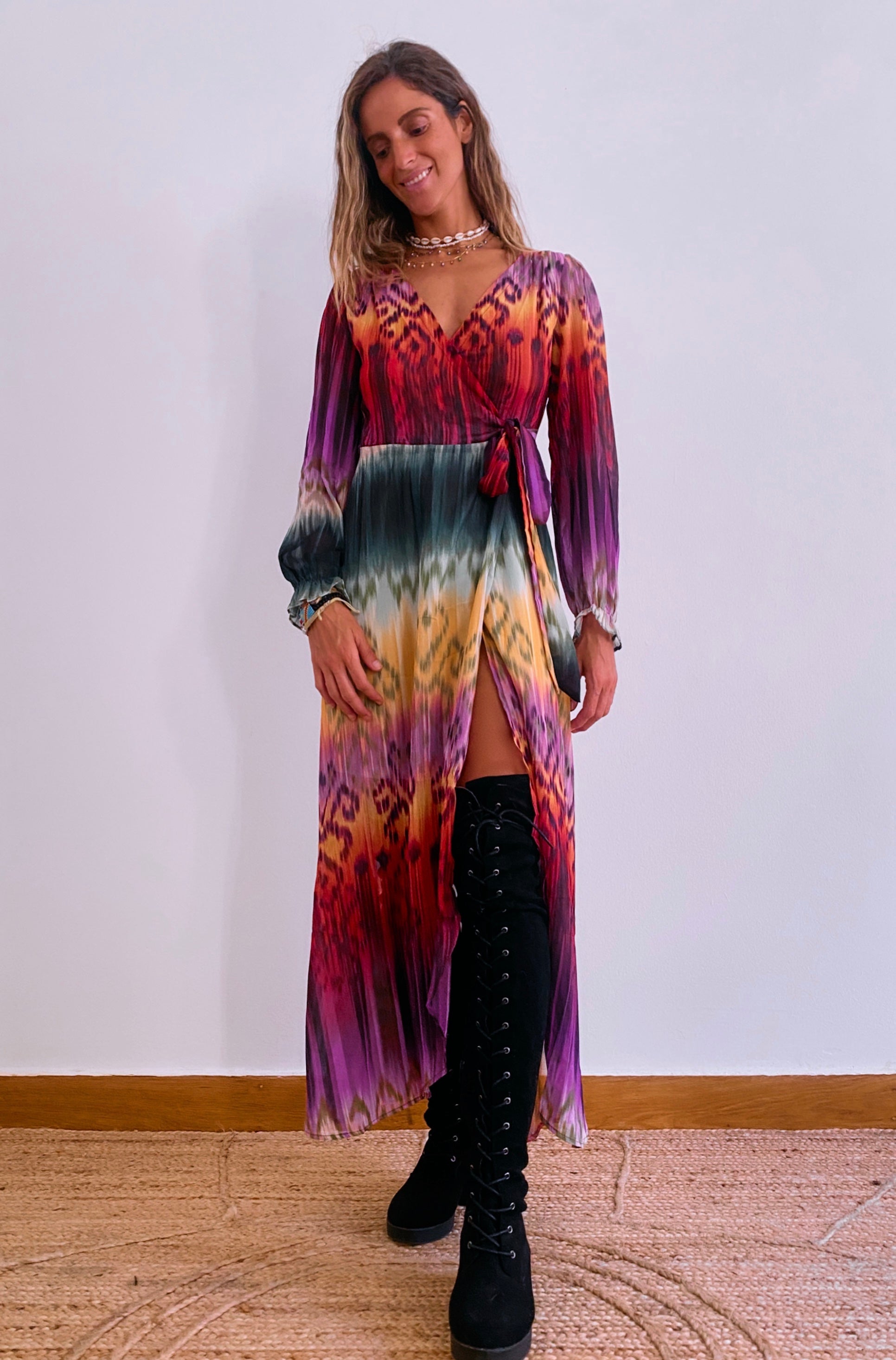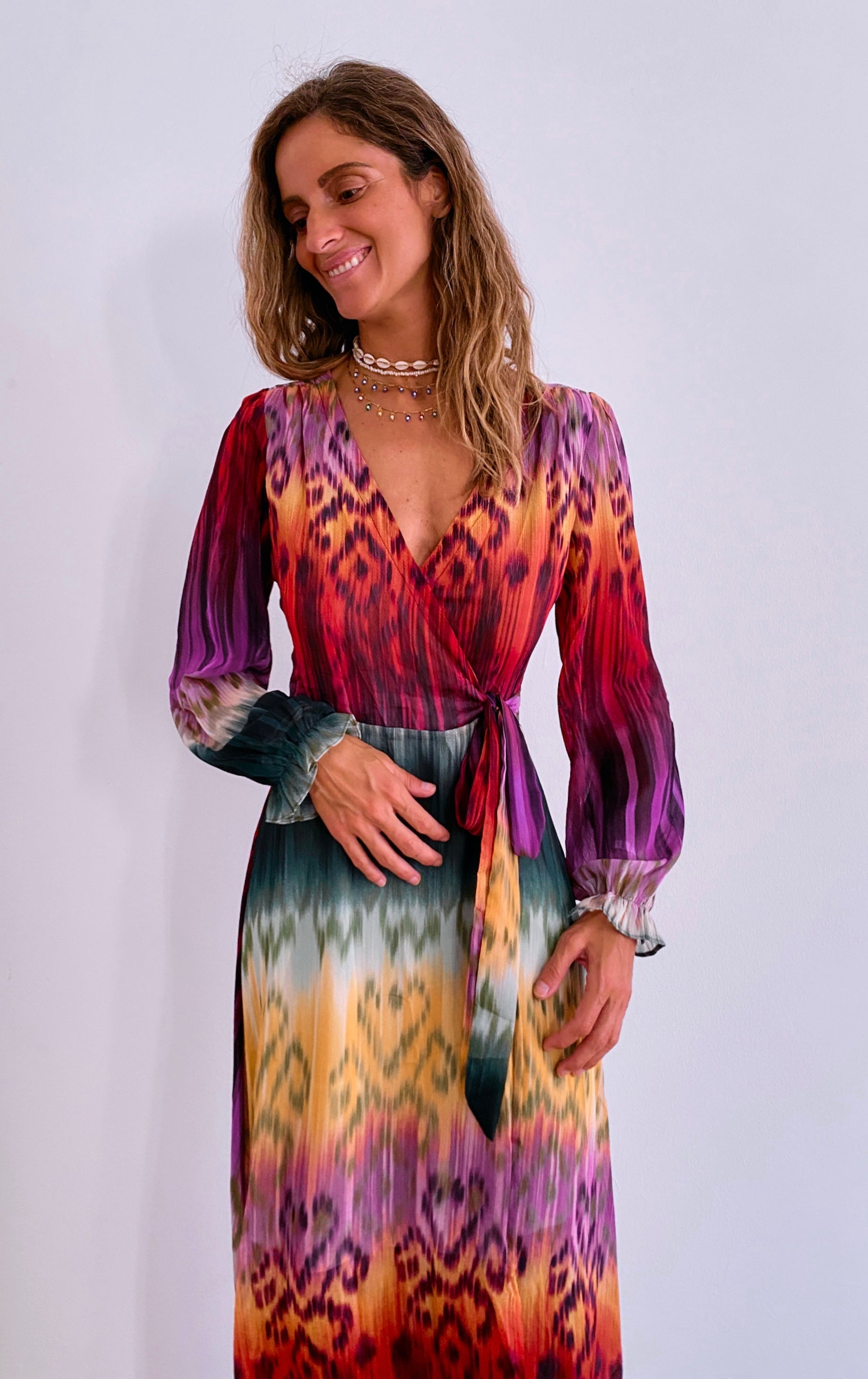 Our floor-length bohemian Justine dress features a soft, flowing fabric that moves gracefully with every step. It hugs the waist with a wrap-around design and a side tie closure. With its original colour palette print that blends rich earth tones, its deep V-neckline and its billowing sleeves, this dress completes the relaxed, romantic vibe, perfect for a chic boho look.