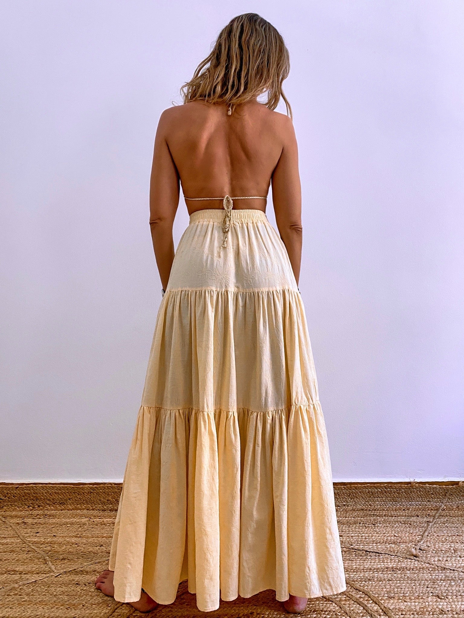 Let it flow with out Karen maxi skirt, made from a beautiful pastel yellow cotton fabric with an embroidered flower design. Off-duty with your favorite tee or timeless with a tucked-in bodysuit, this skirt has endless ways to wear.