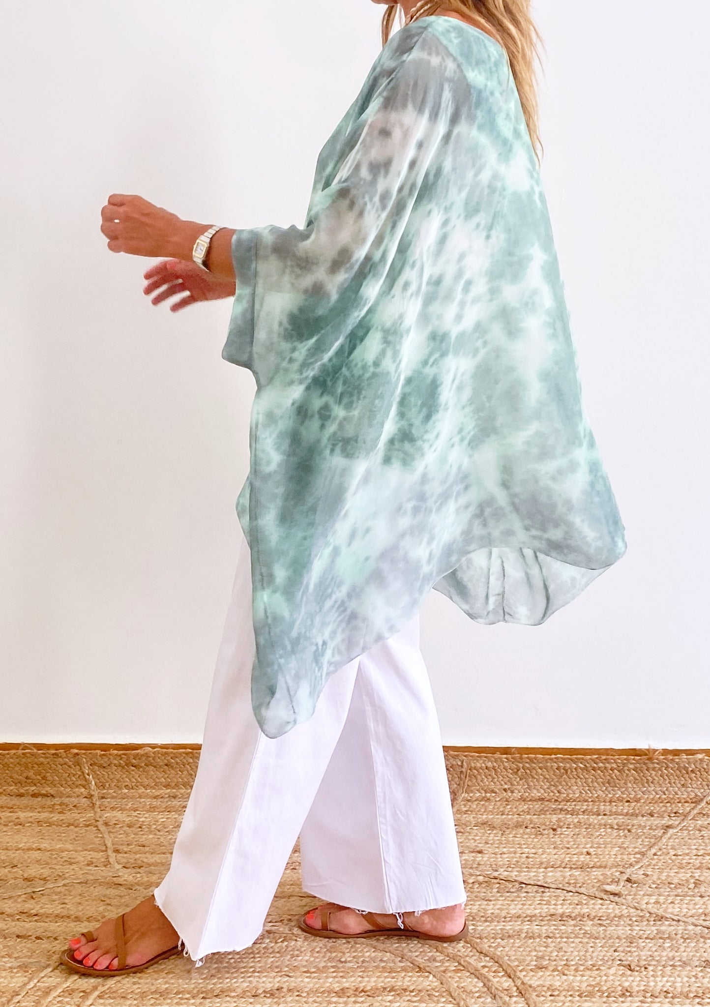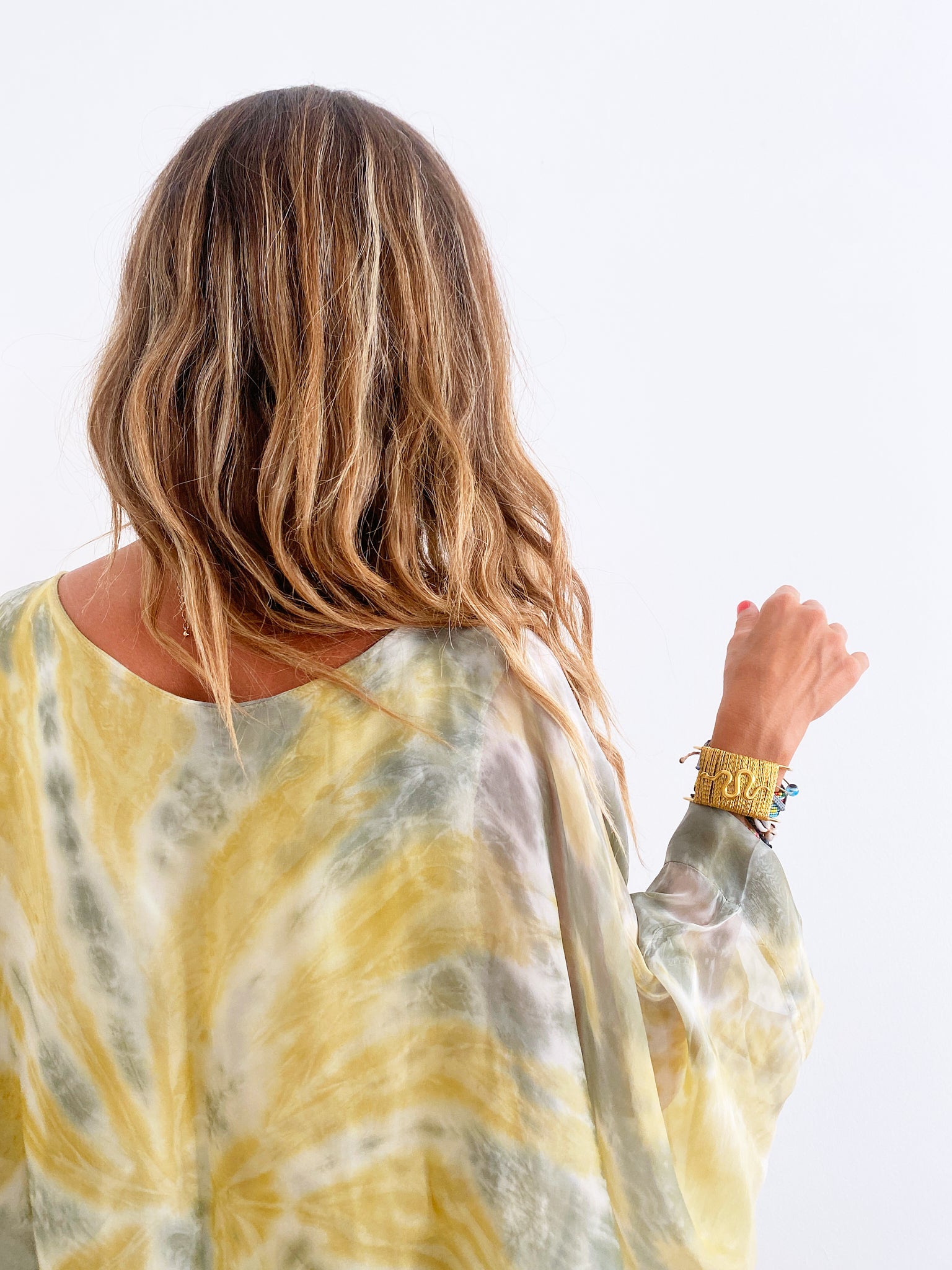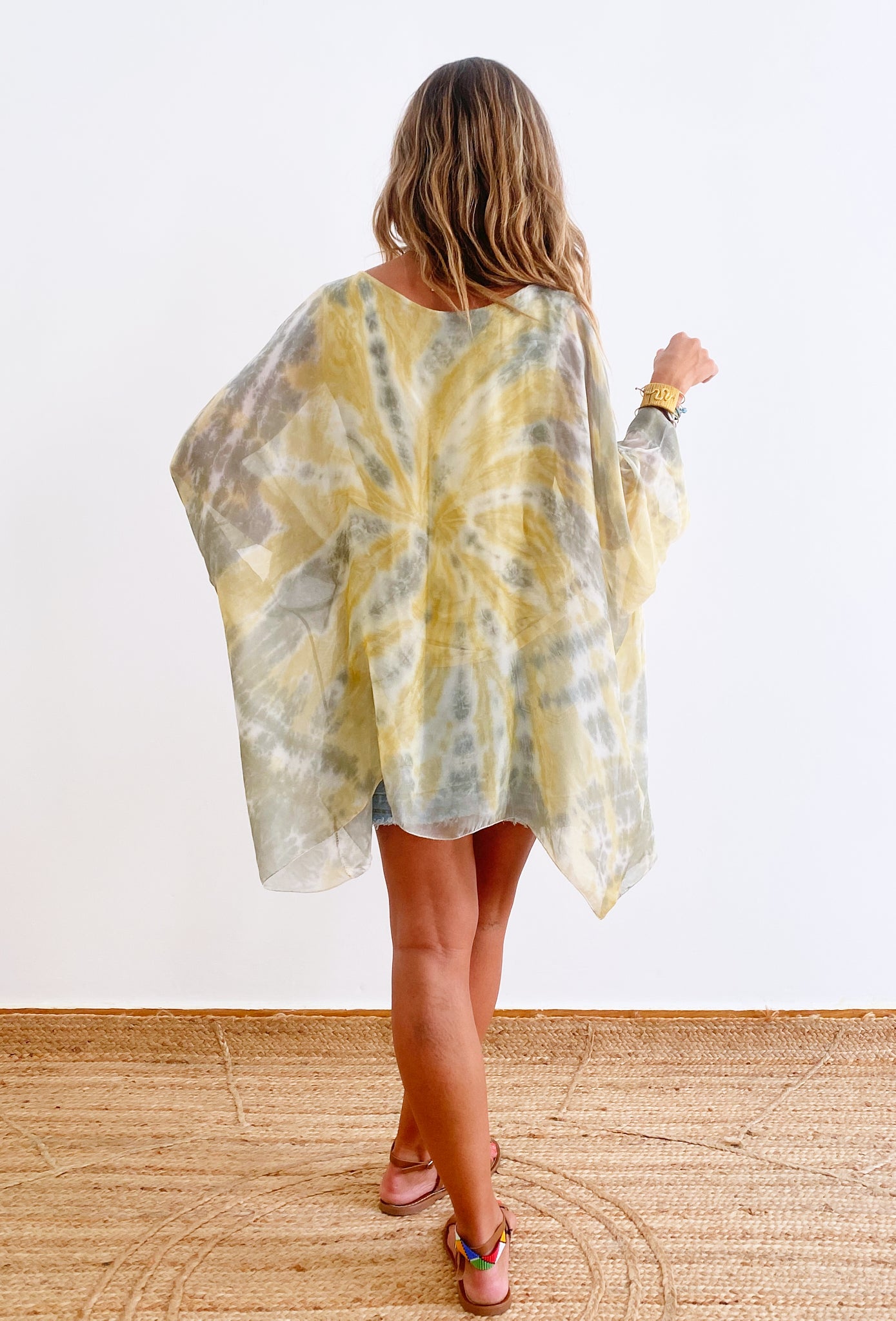 Half length sleeves / Round neckline / Silk blended fabric / Tie Dye garment / Elastic cotton tie die lining / Drop shoulder / Relaxed fit / Wide silhouette