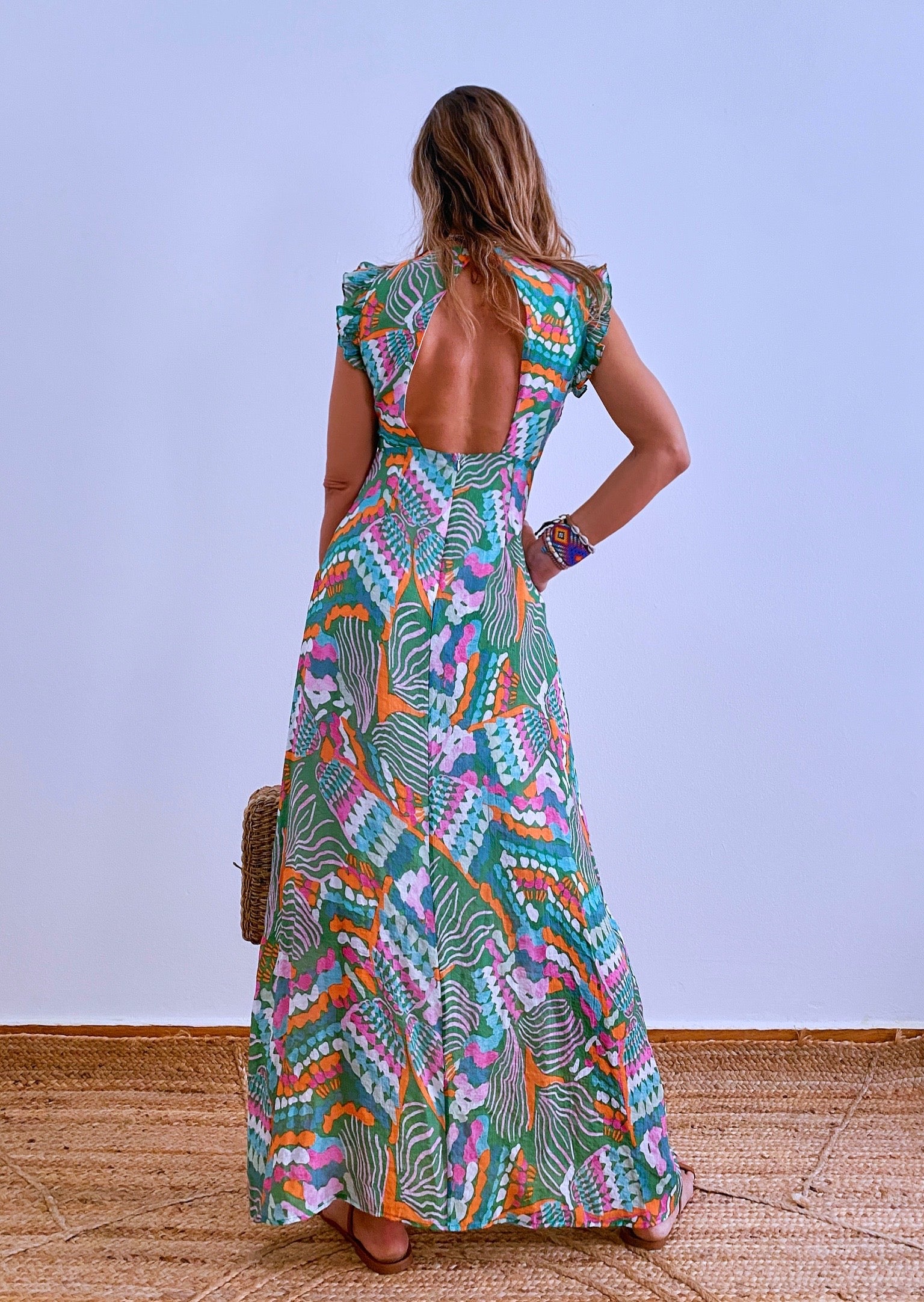 V neckline / Sleeveless / Open back / Ruffled armholes / Fitted waist / Back zip fastening / Lightweight fabric / Lining / Printed design / Loose fit