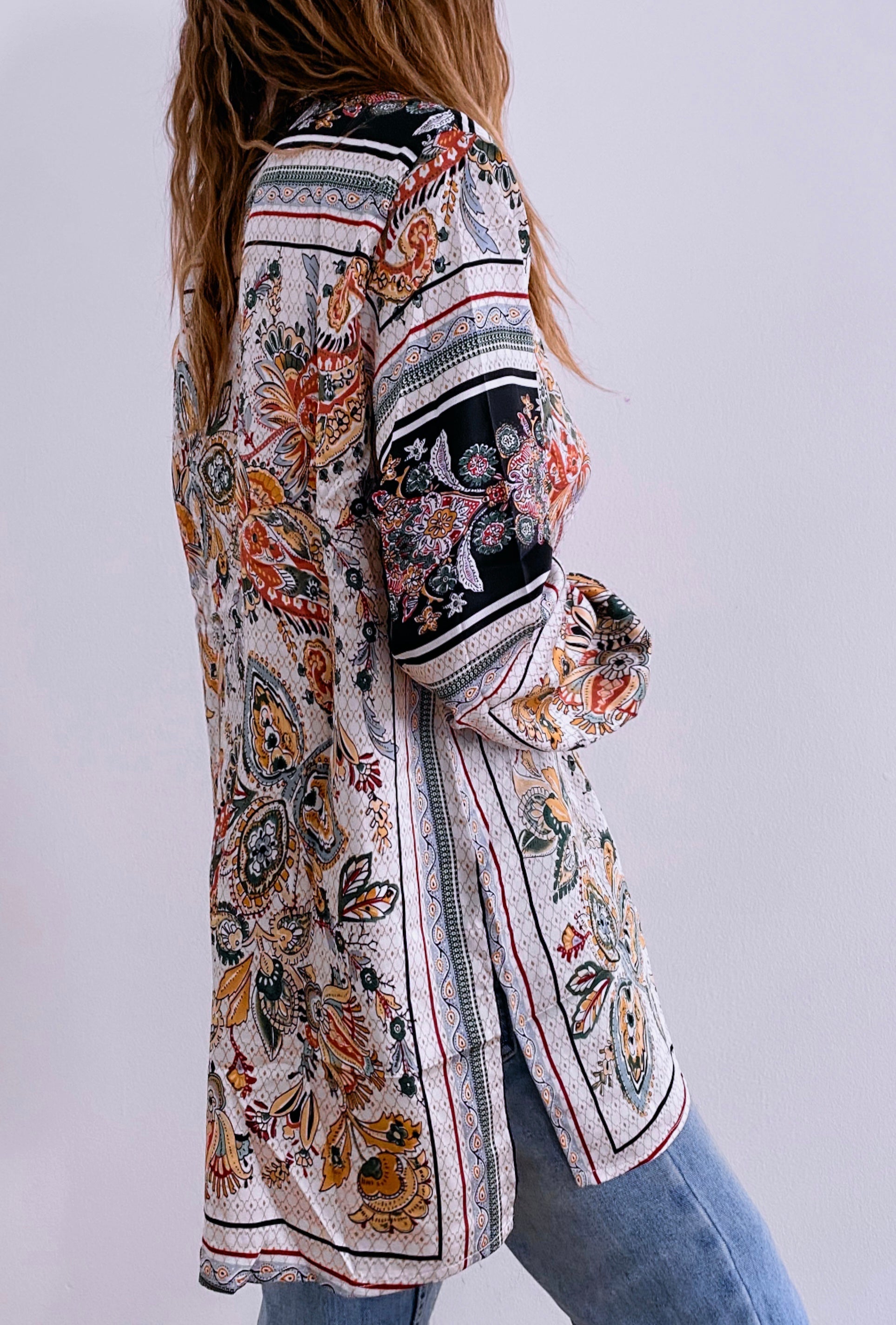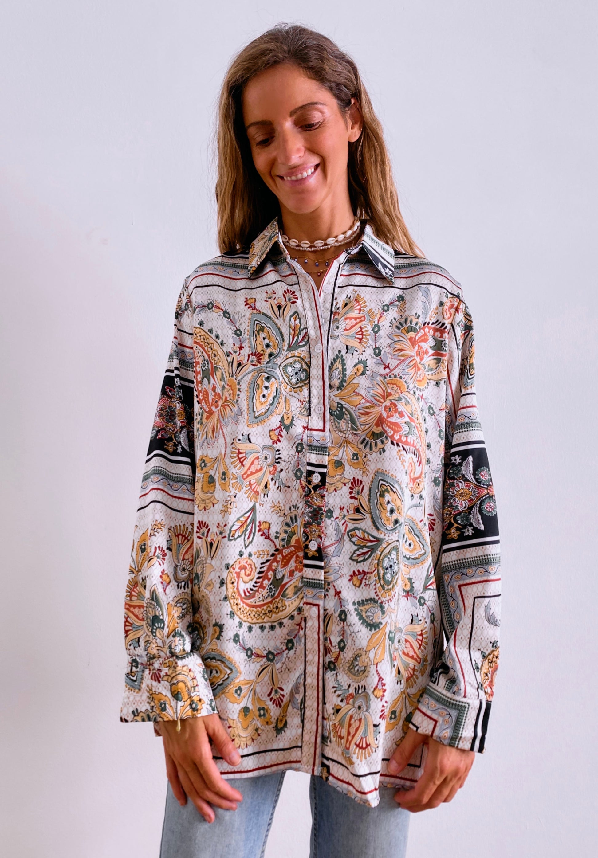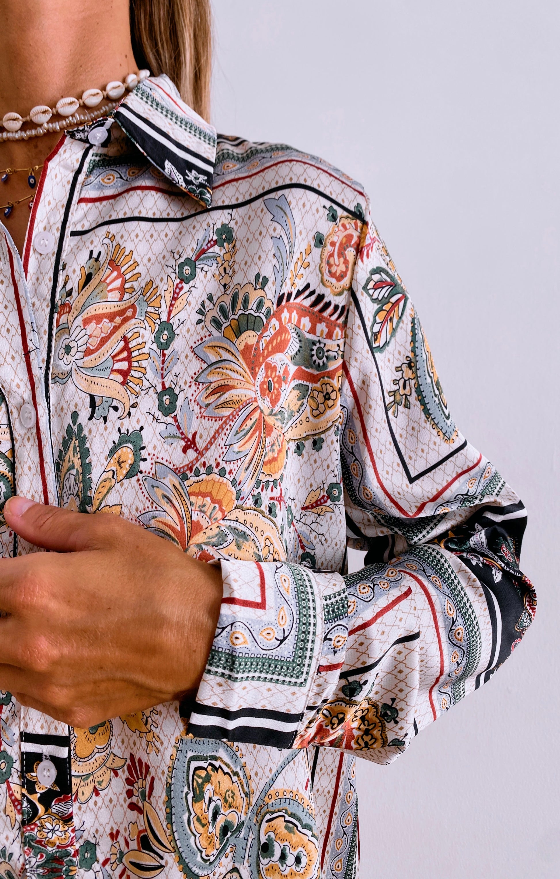 Our Lauren long-sleeve shirt is crafted from a premium raso polyester fabric with a silk-like hand feel, ensuring both comfort and elegance. The intricate, multicolour floral and paisley print adds a striking visual appeal, making it a statement piece. The fabric is soft yet structured, perfect for an effortless, chic look. Versatile enough to be worn on its own or paired with matching trousers for a bolder ensemble, it’s ideal for both casual and elevated occasions.