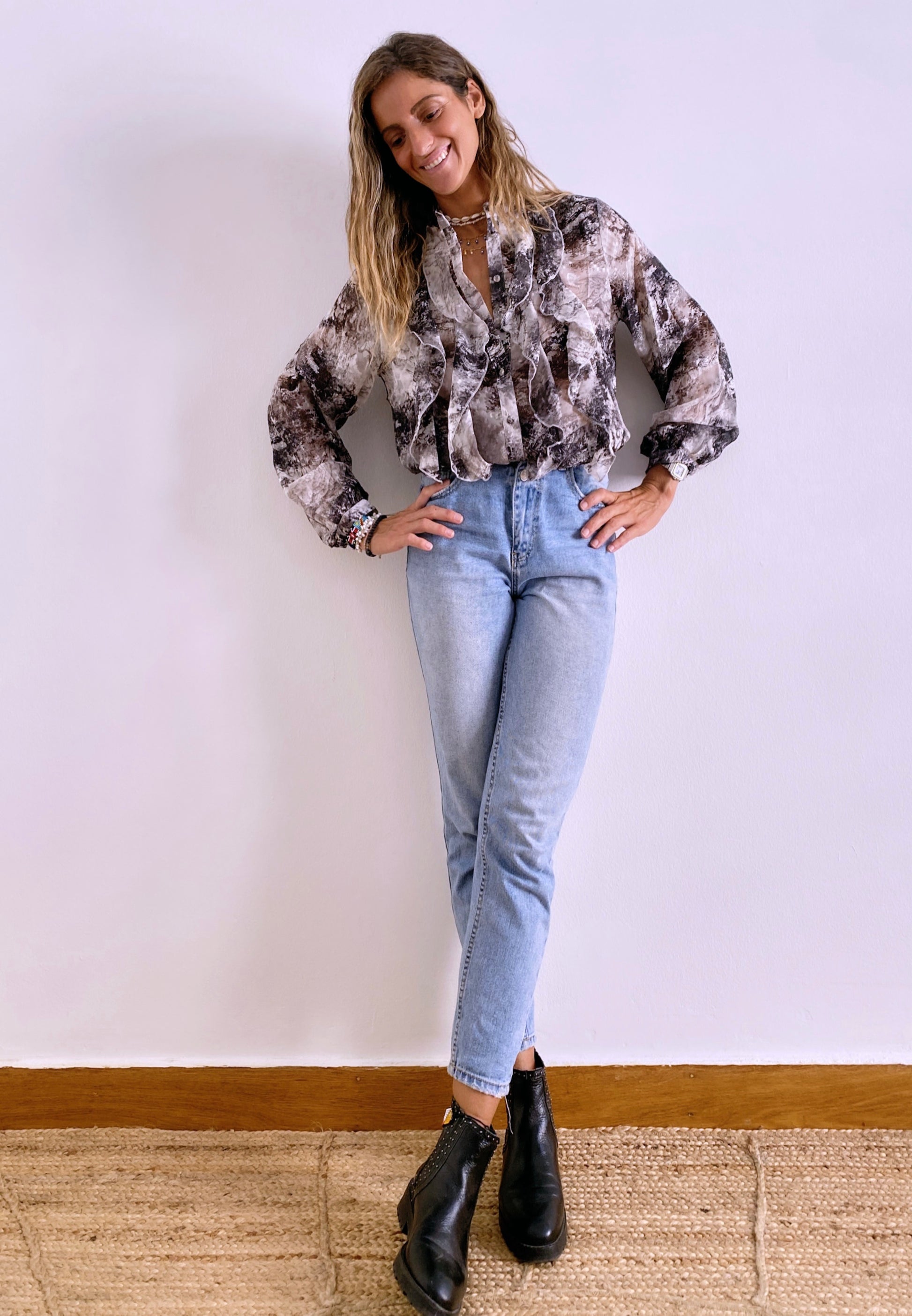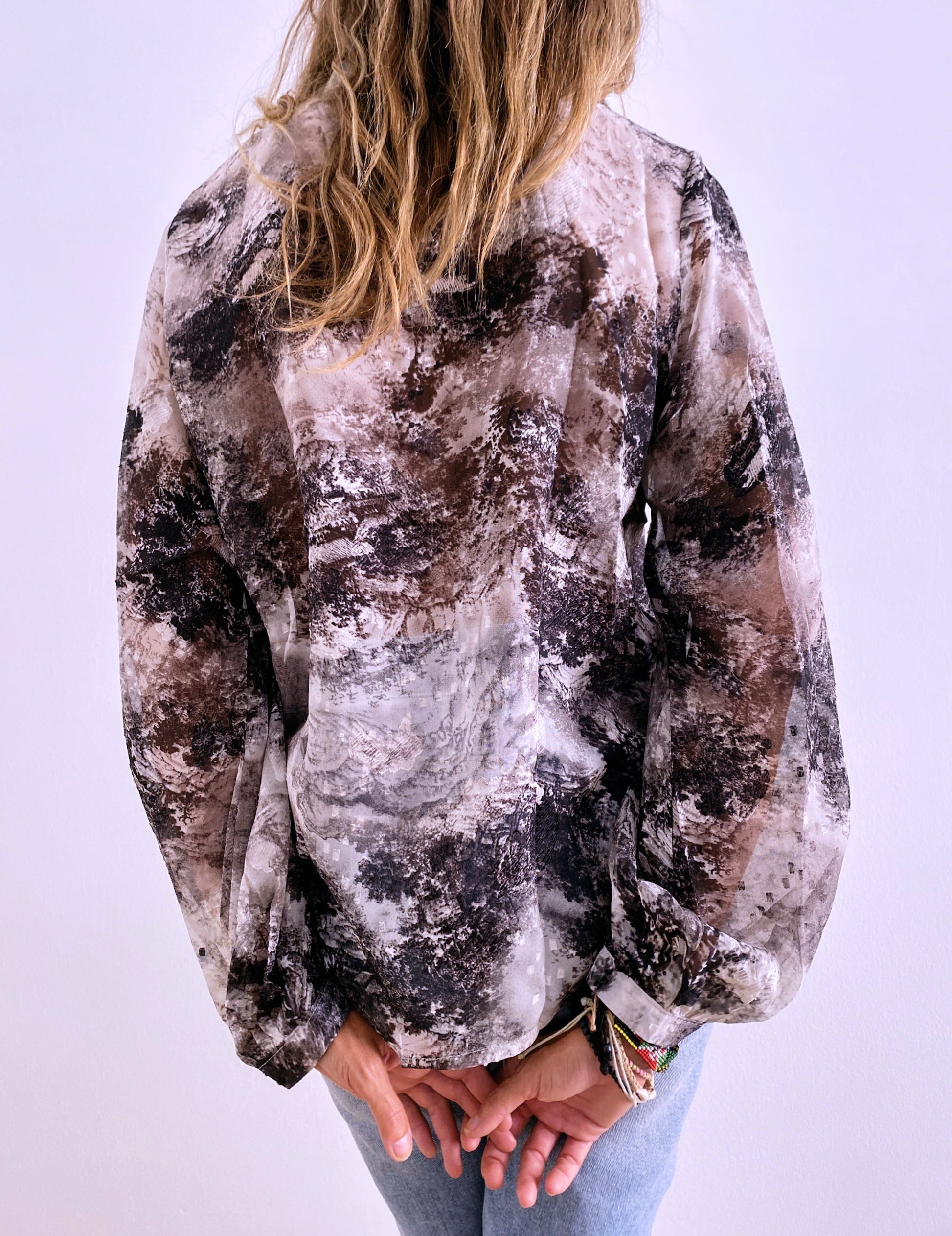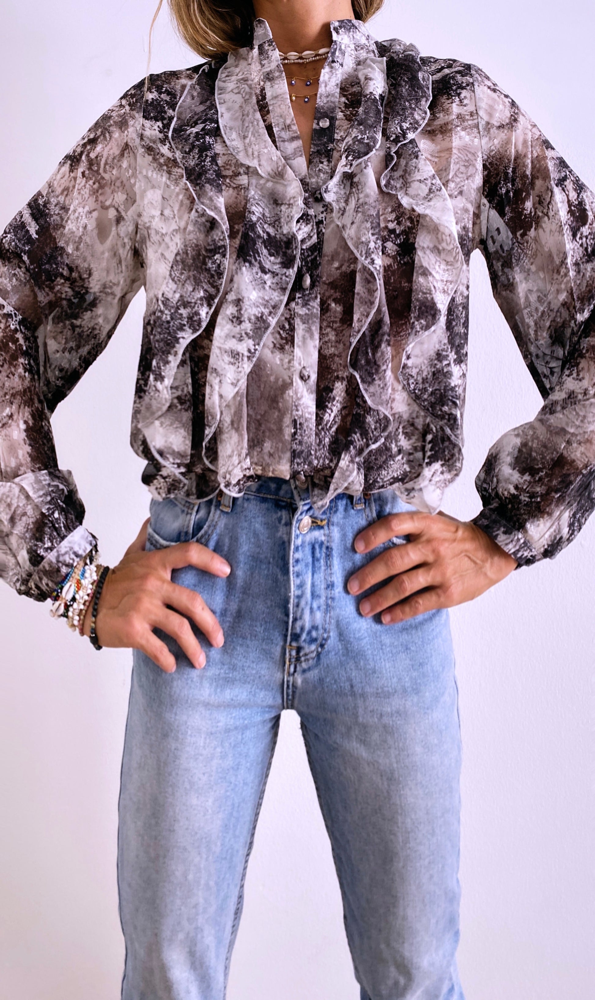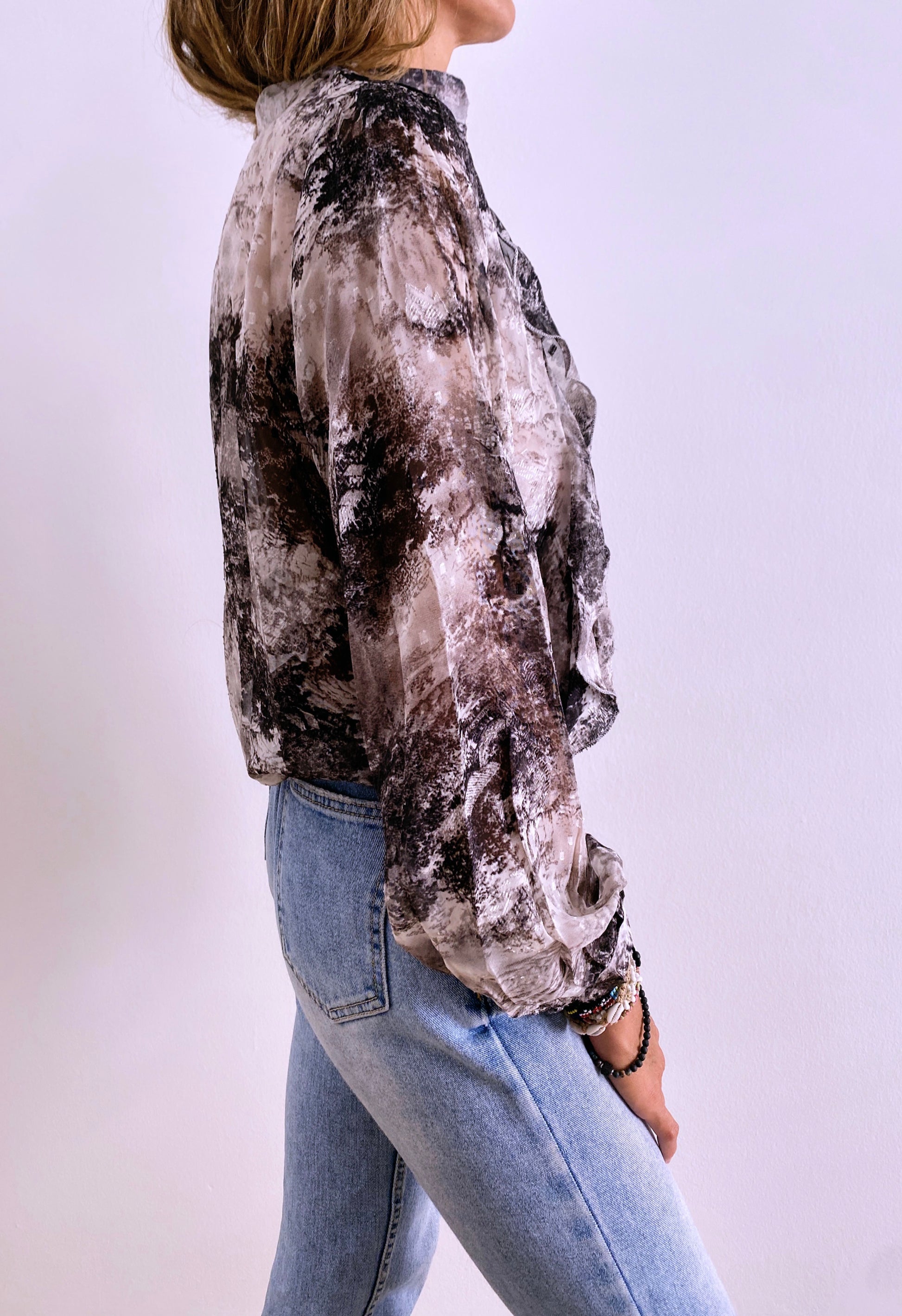 Long sleeves shirt / Round collar / Buttoned cuffs / Ruffles on front / Fluid and lightweight fabric / Printed design / Devoré details / Delicate fit