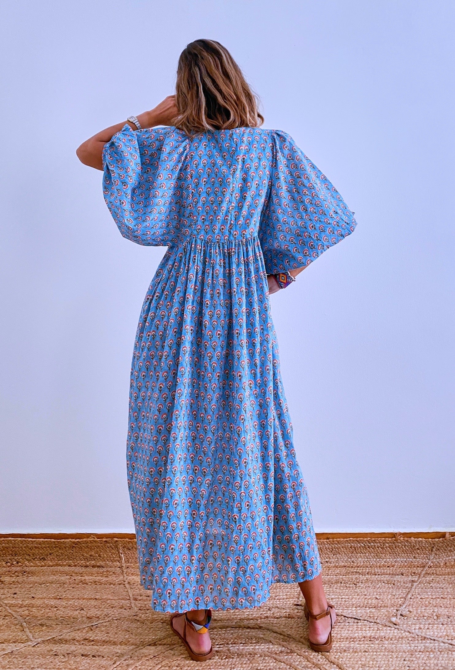 Get comfort and style with our boho-inspired Magalie maxi dress, crafted from high quality muslin cotton fabric with an allover wood block-inspired print.