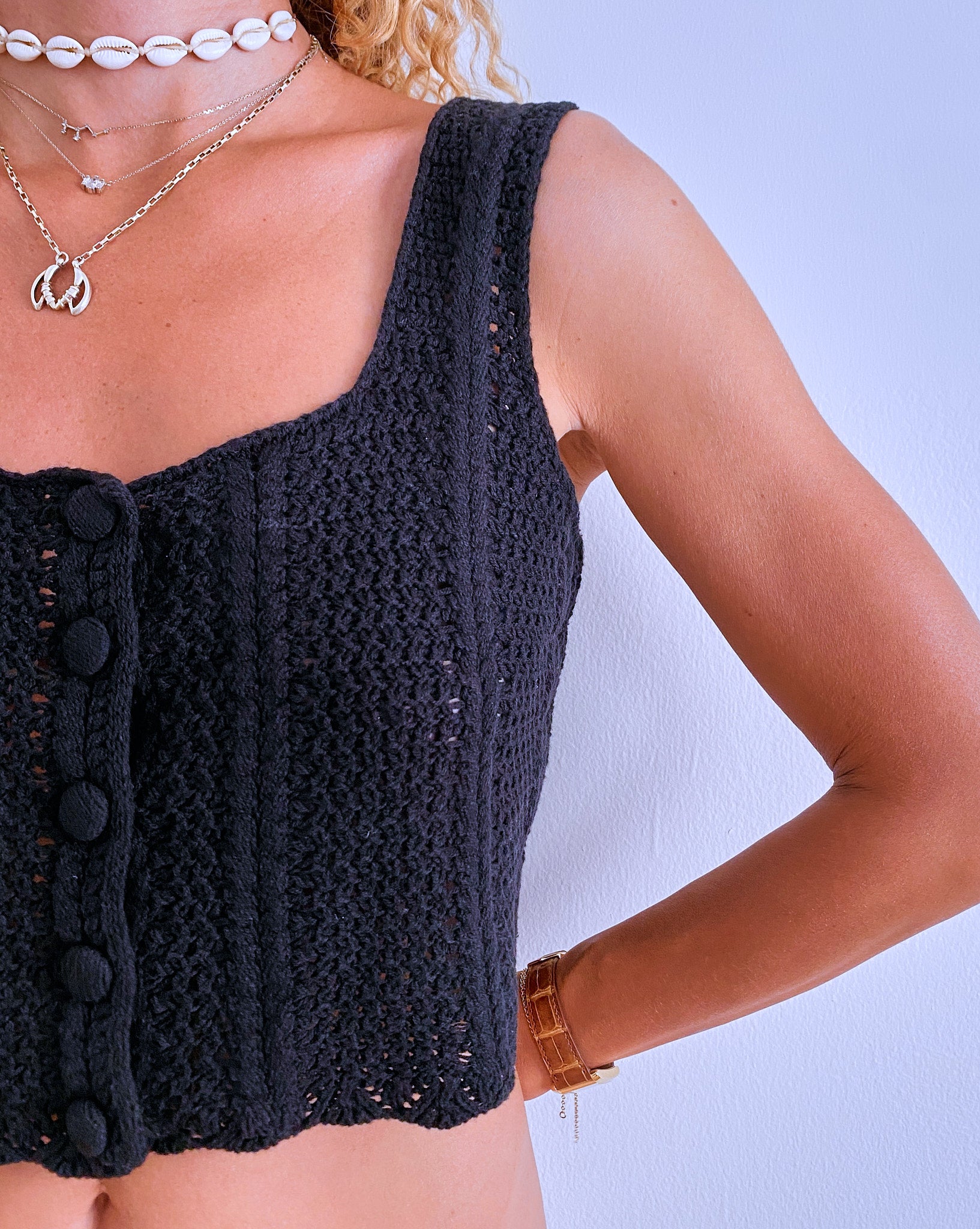 Knit crochet / Cropped design / Square neckline / Buttoned top / Covered buttons / Soft touch / Loose fit