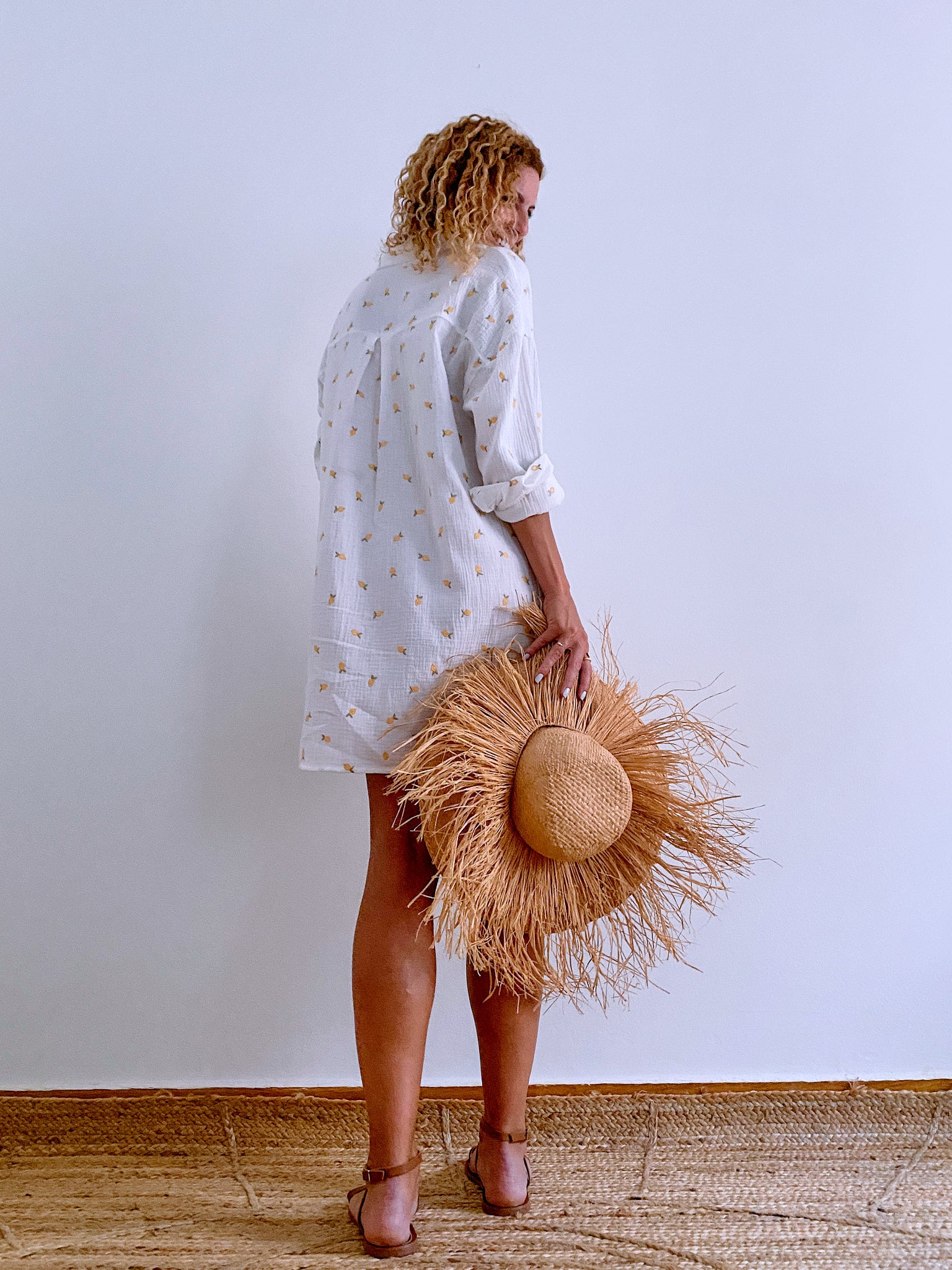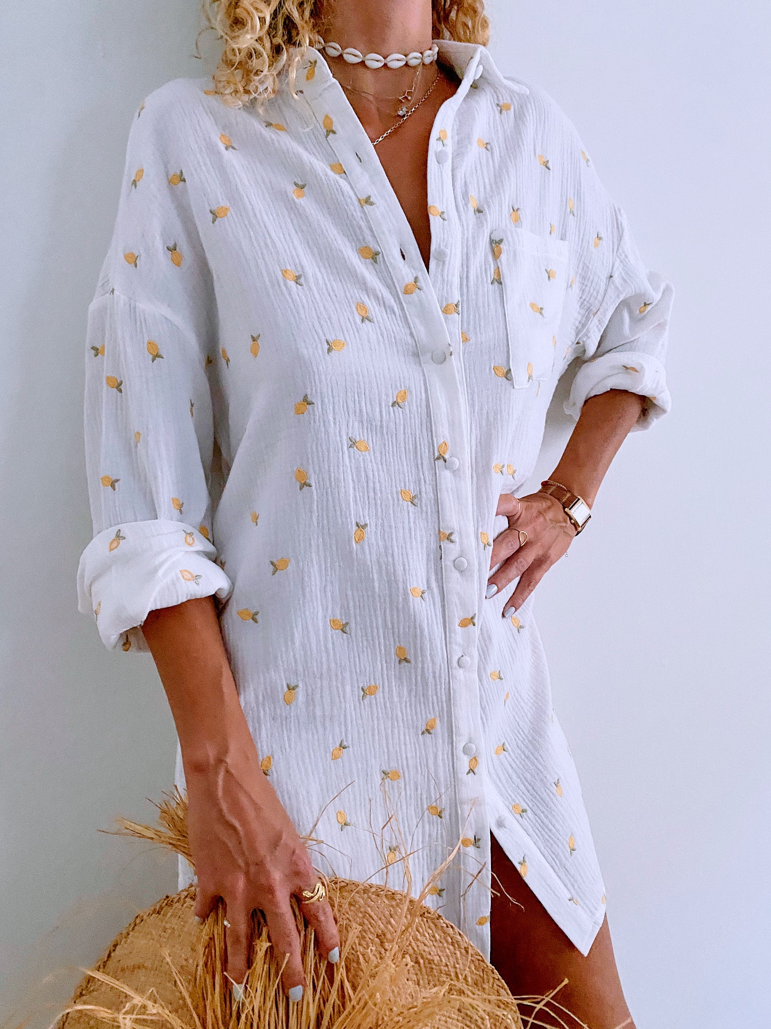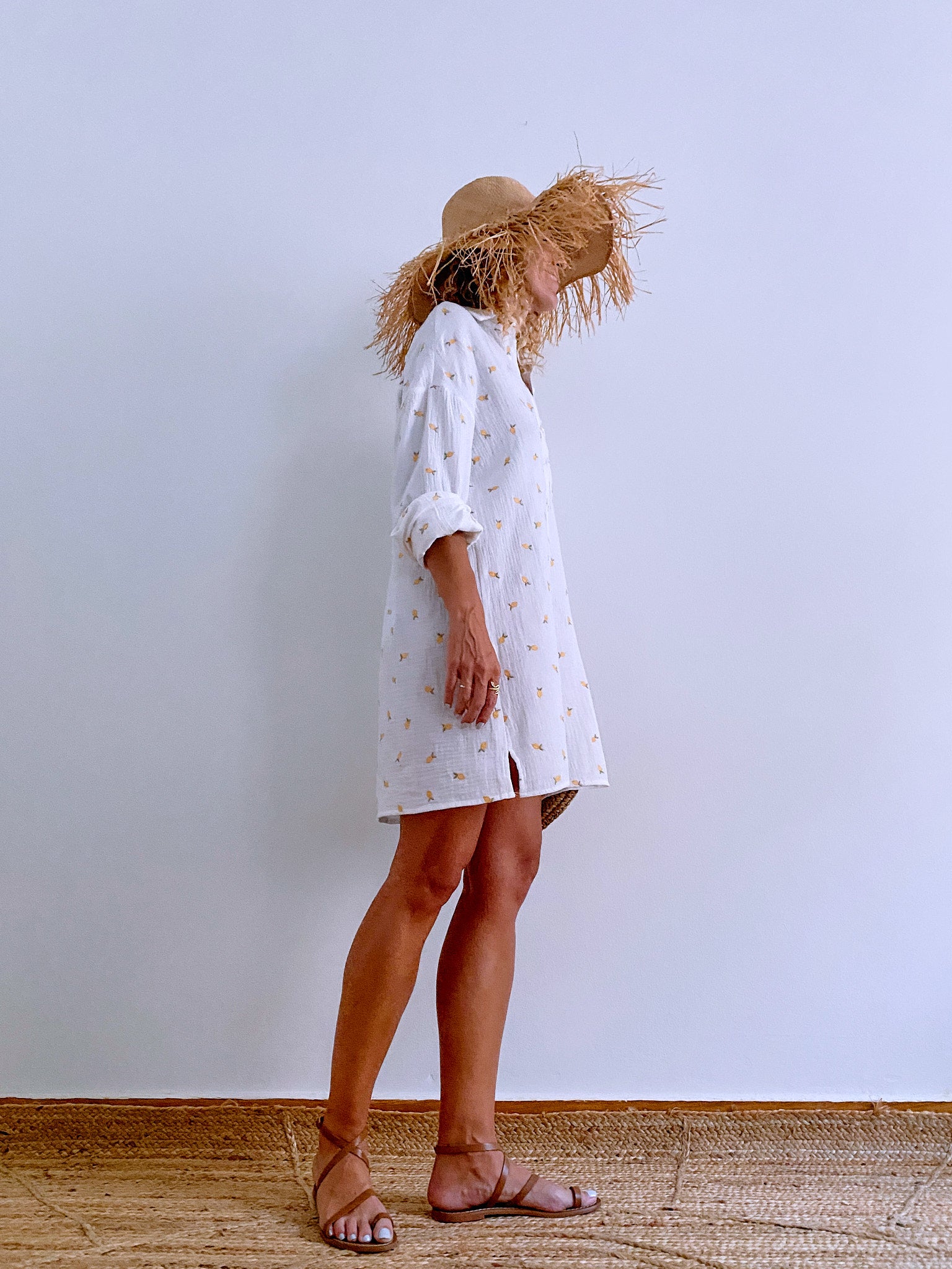 Stay cool this summer with our Natalie shirt dress in breezy cotton double gauze perfect for your days near the shore. Embroidered lemon details add a charming touch to its relaxed fit.
