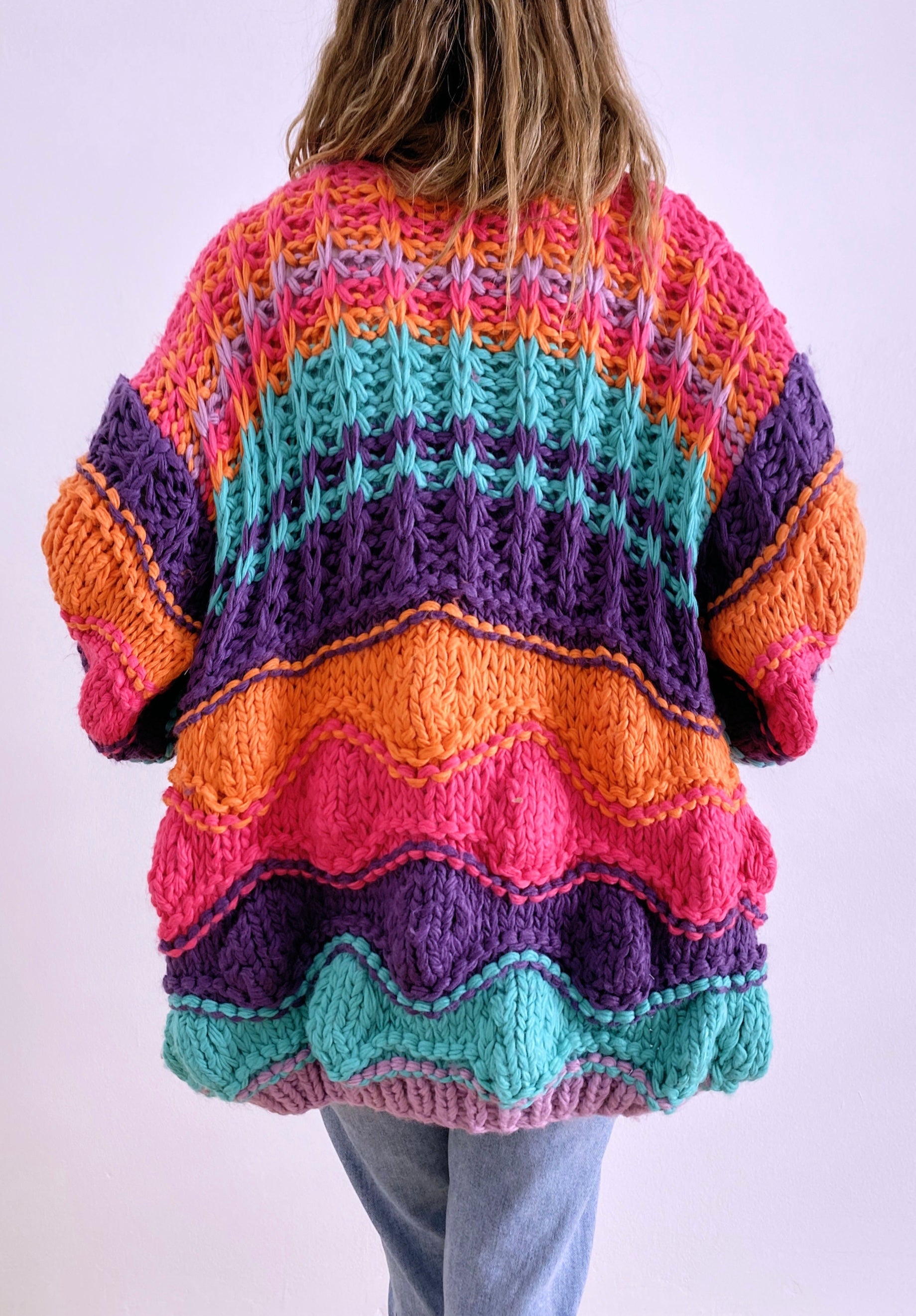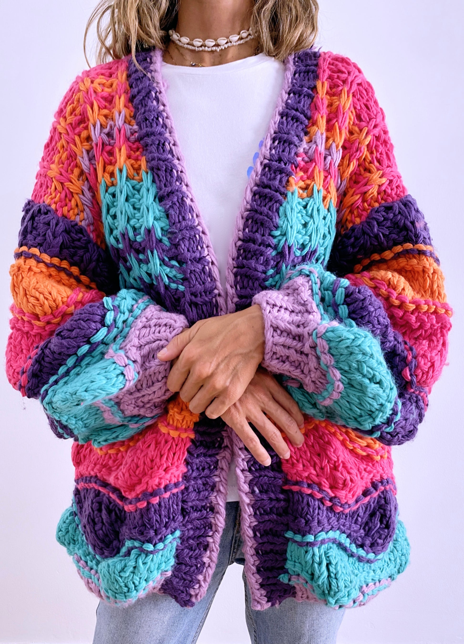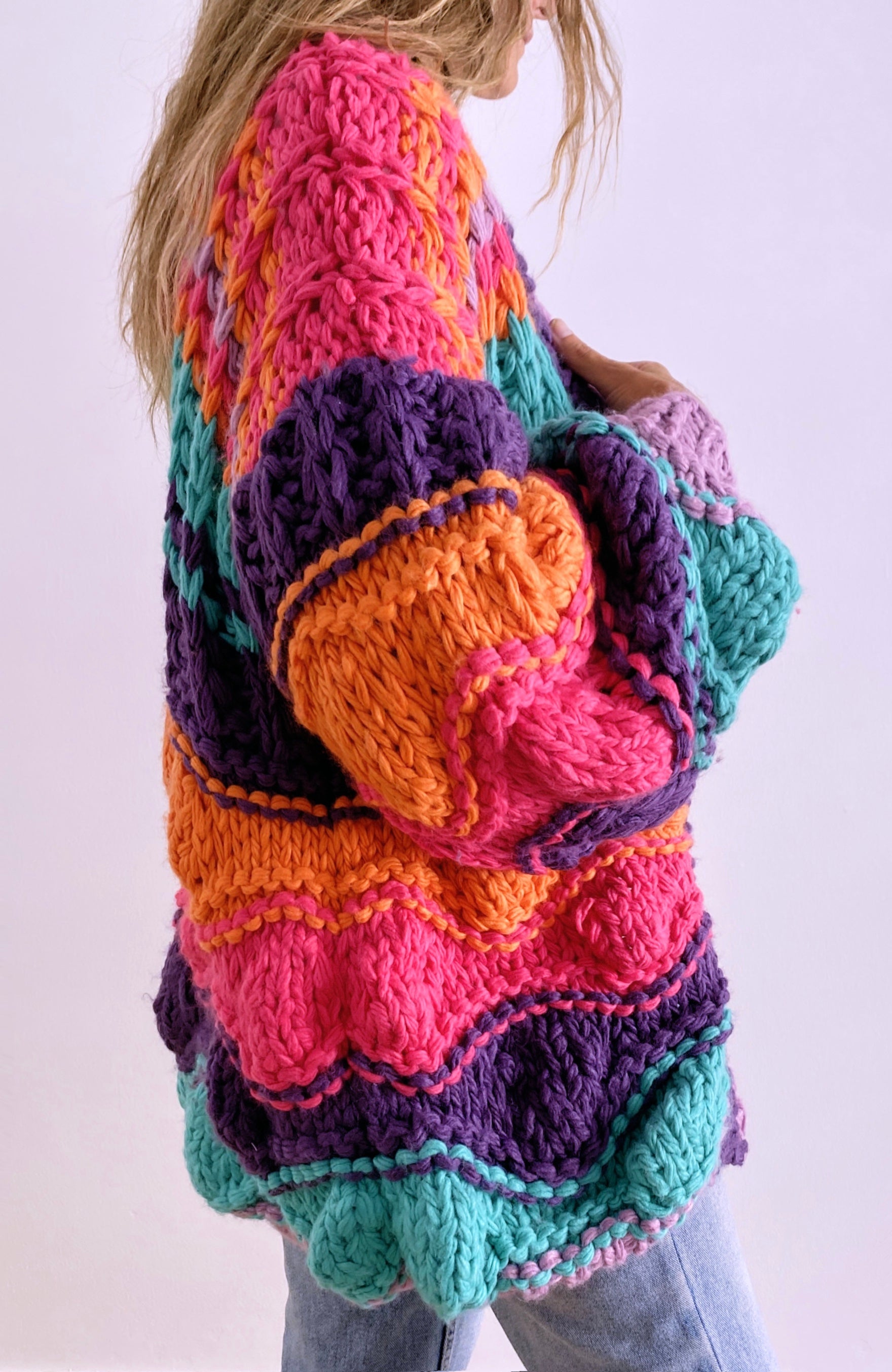 Our premium Simone cardigan is hand crafted from a heavy weight knit, making it both warm and eye-catching. Its vibrant colour palette creates a playful, standout look perfect for adding a pop of colour to your winter wardrobe. Its chunky, textured knit design adds depth and character while its oversized fit ensures a comfortable and relaxed silhouette. This cardigan combines craftsmanship with a trendy, artisanal feel, making it a unique statement piece for any occasion.