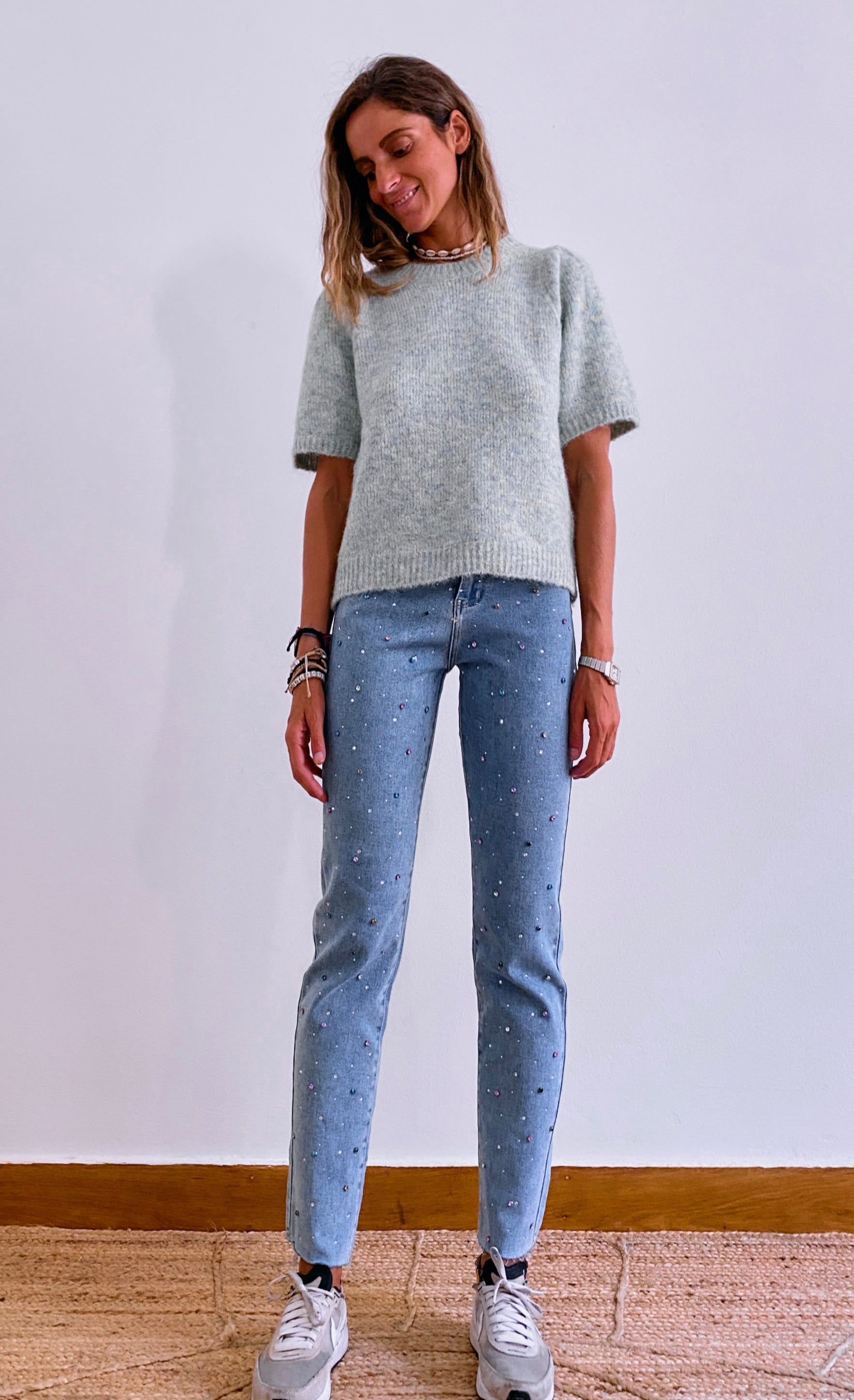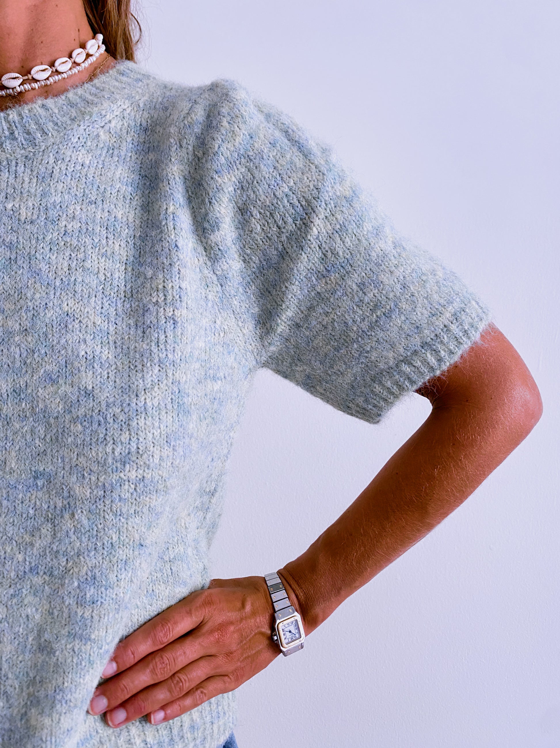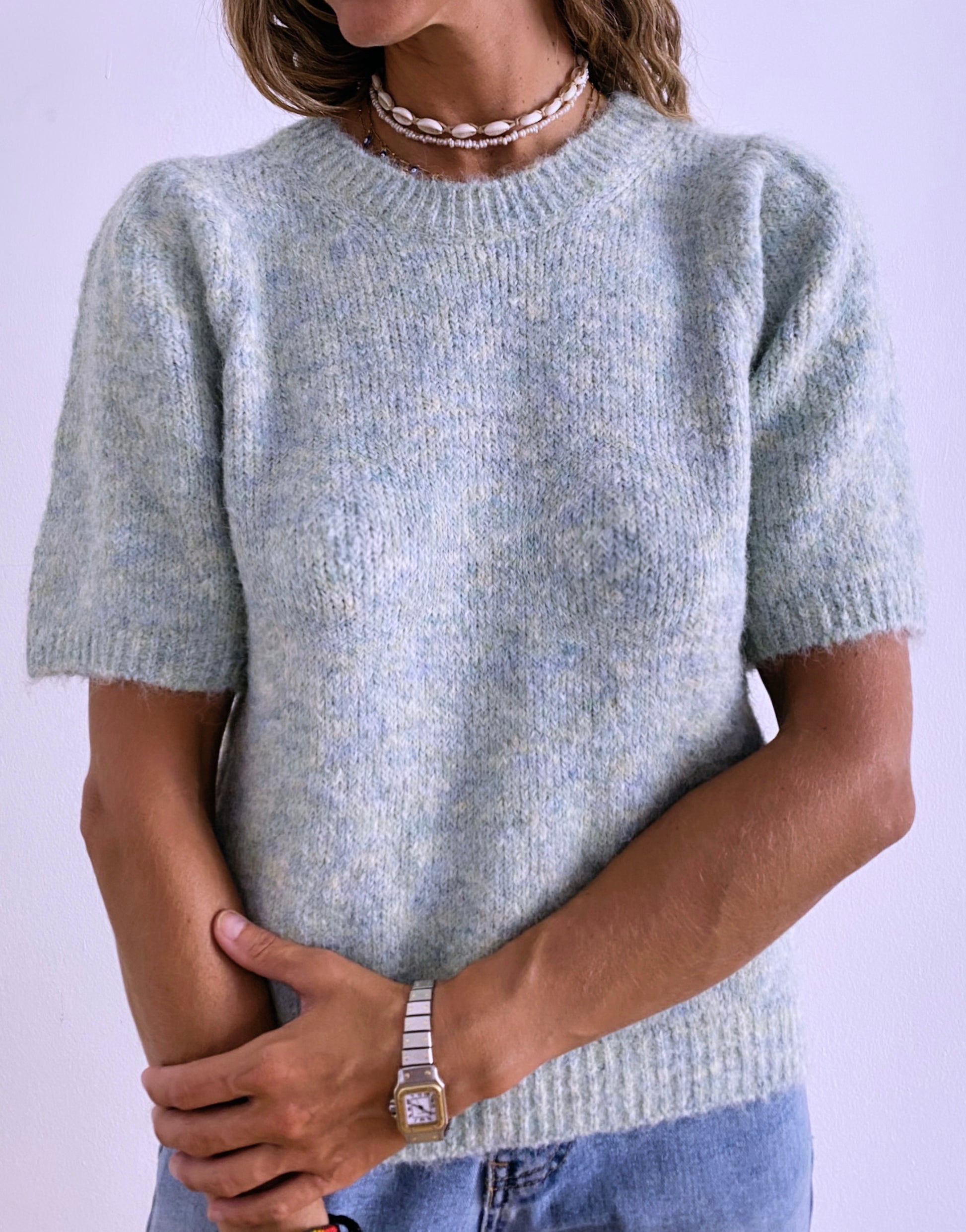 Our Solène knitted jumper stands out with its harmonious blend of blue and green, creating a balanced and eye-catching colour mixl. The rounded neckline and short, romantic-shaped sleeves add to its charm. Warm and extra soft, it's ideal for the transitional period before winter, offering both comfort and style as the weather cools down. Perfect for layering or wearing on its own for an effortless, chic look.