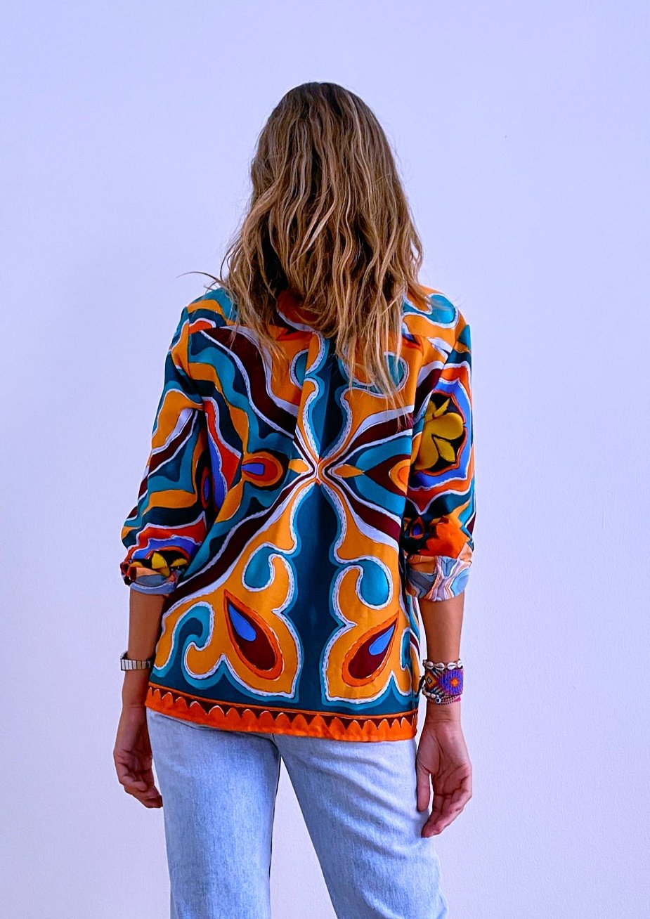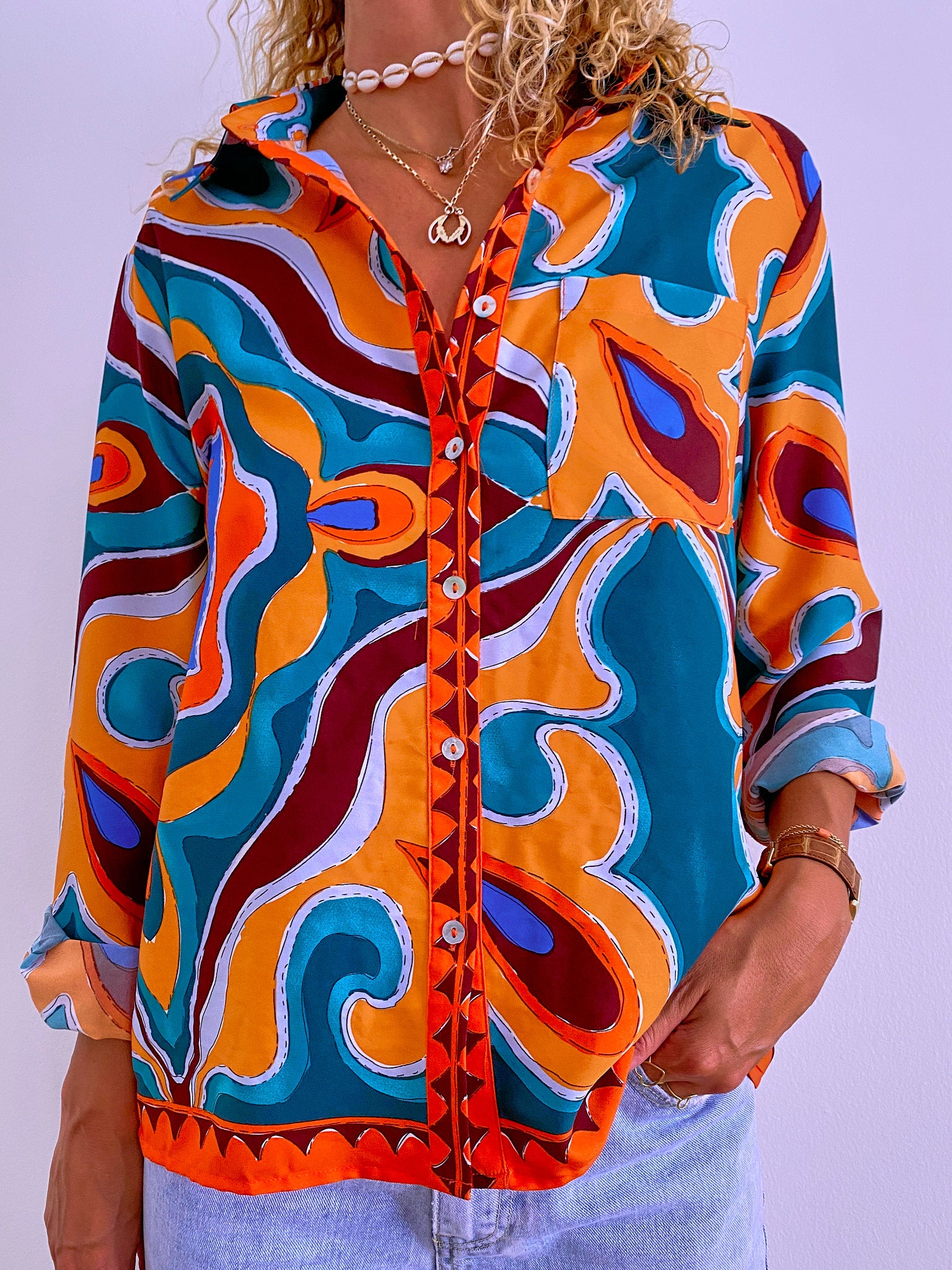 Joyful and daring. Our Zaira shirt with its fluid fabric and its colourful print is undoubtedly a striking garment that will add personality to your outfits. It can be styled with any pair of jeans or for a total look, with its own matching trousers. Long live the colour!