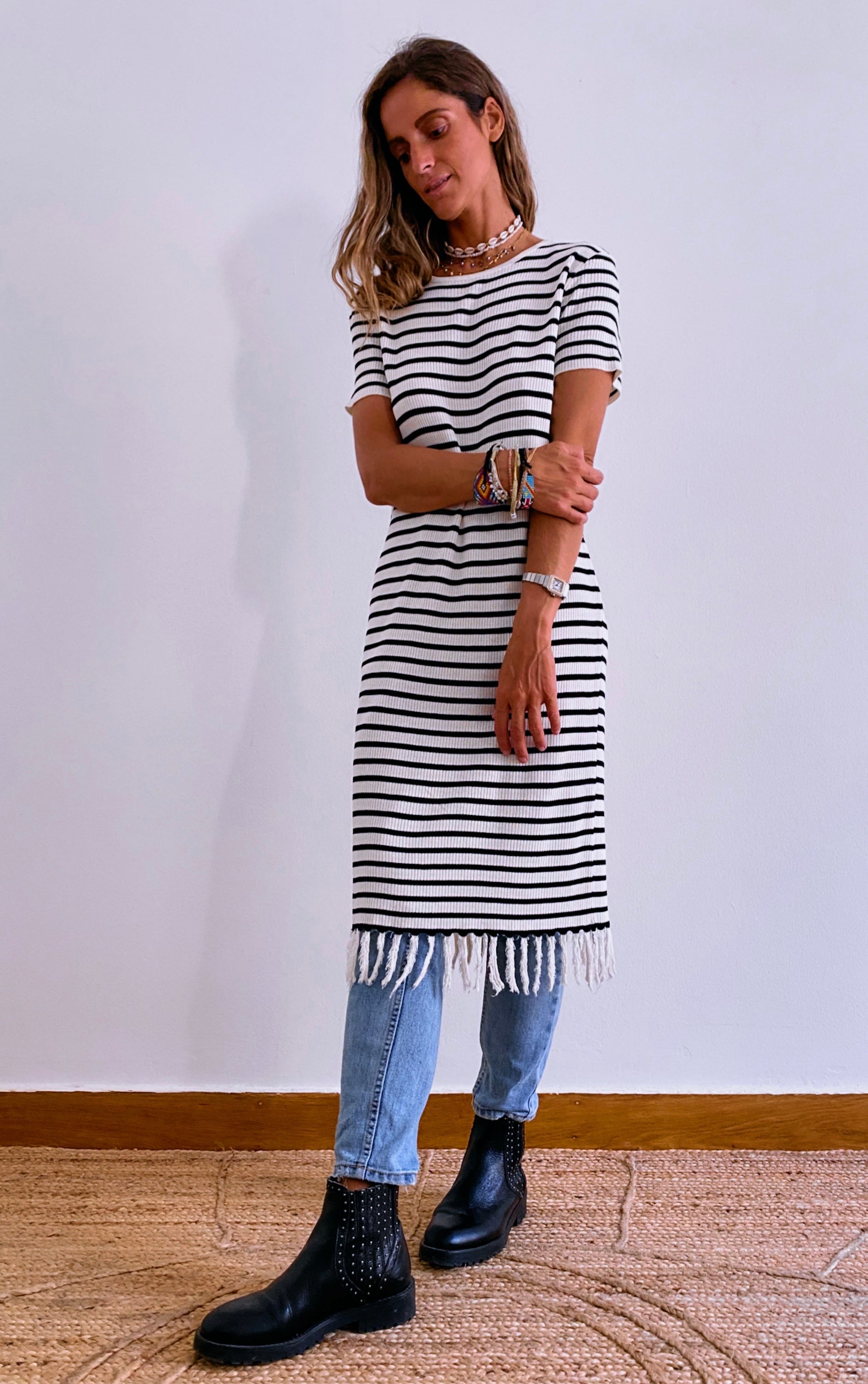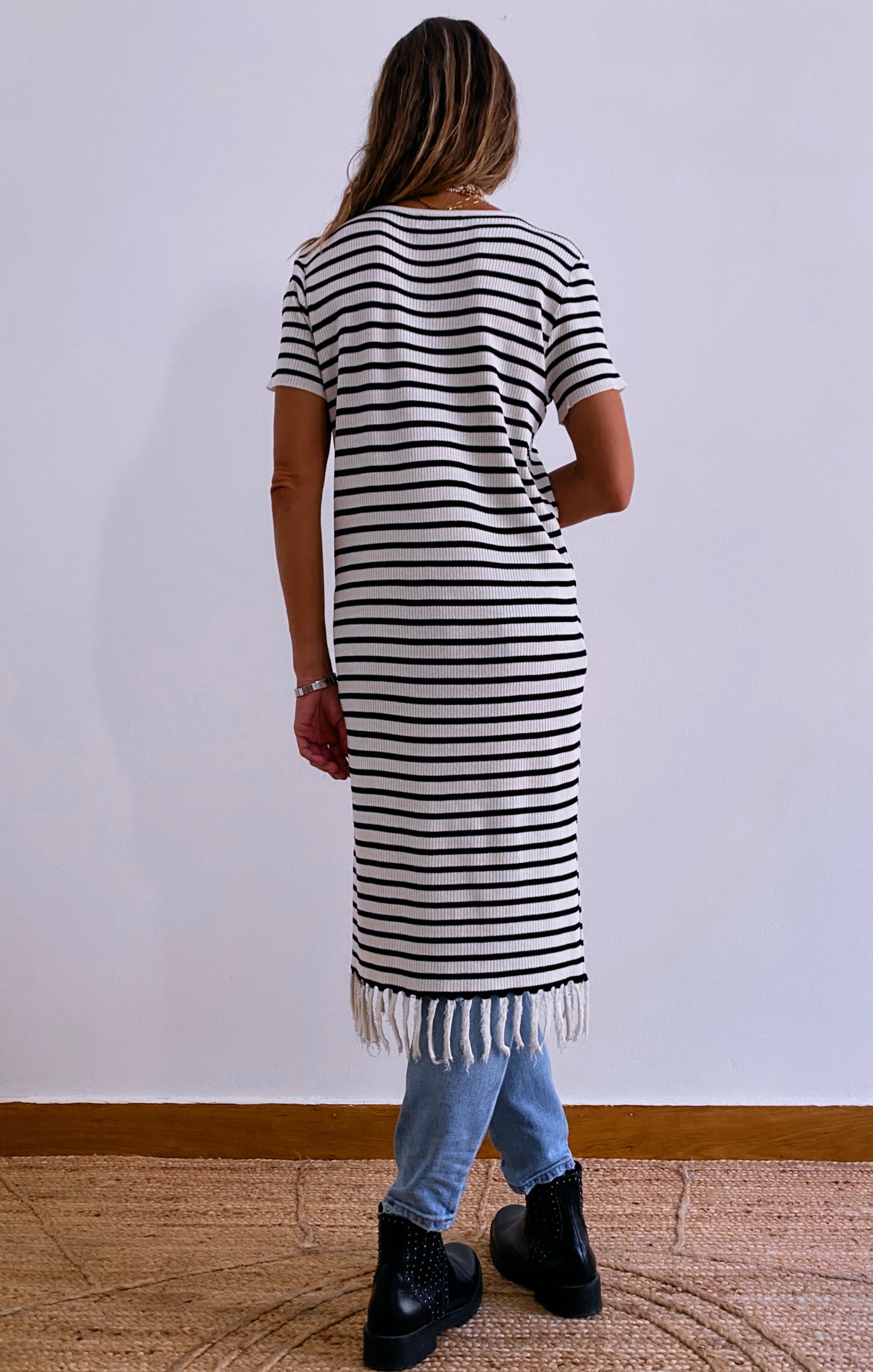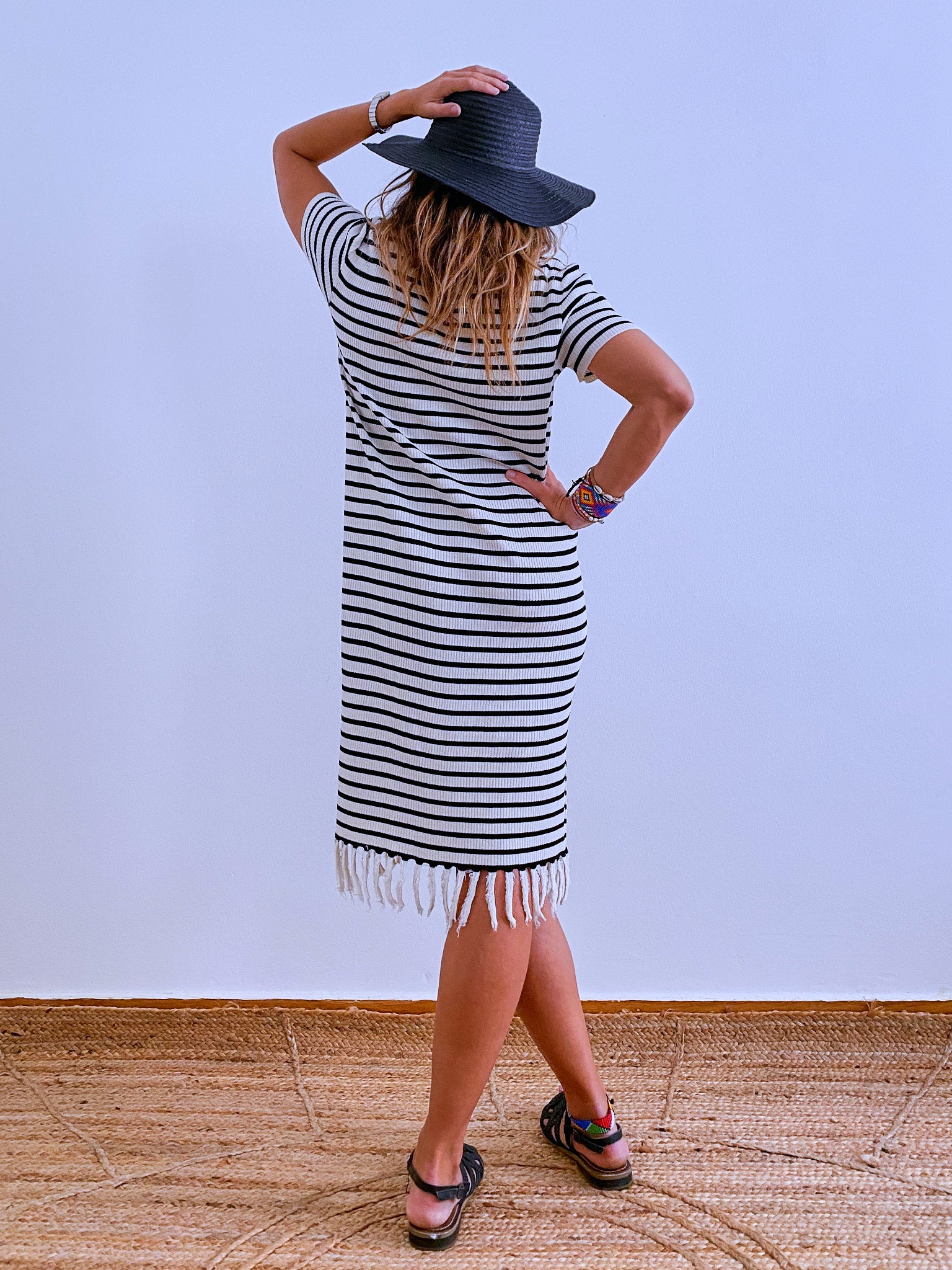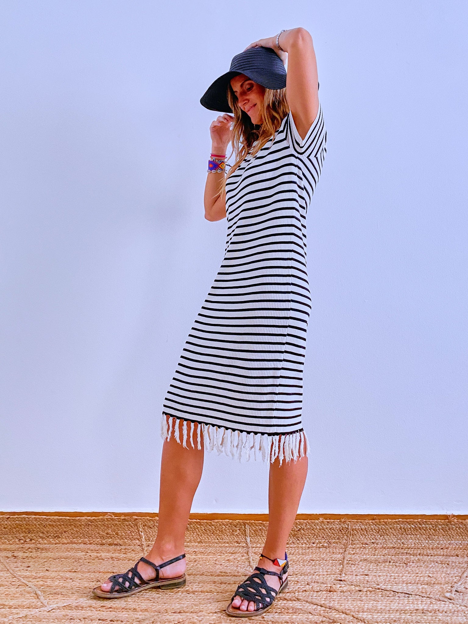 Our boho chic striped knit crochet Zoe midi dress, features a round neckline and fringe hem for added flair. With its carefree style and loose fit, it's perfect for leisurely days strolling through town. We recommend styling it over a pair of jeans. Don't forget the boots! ;)