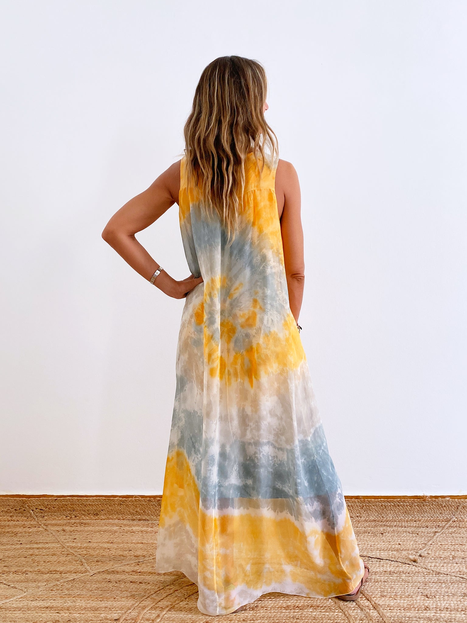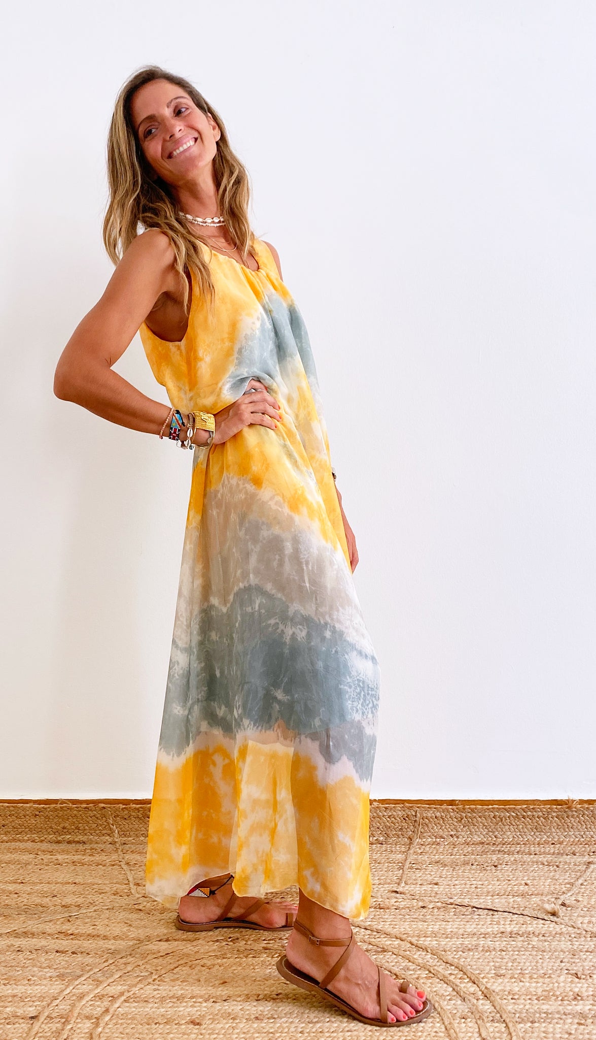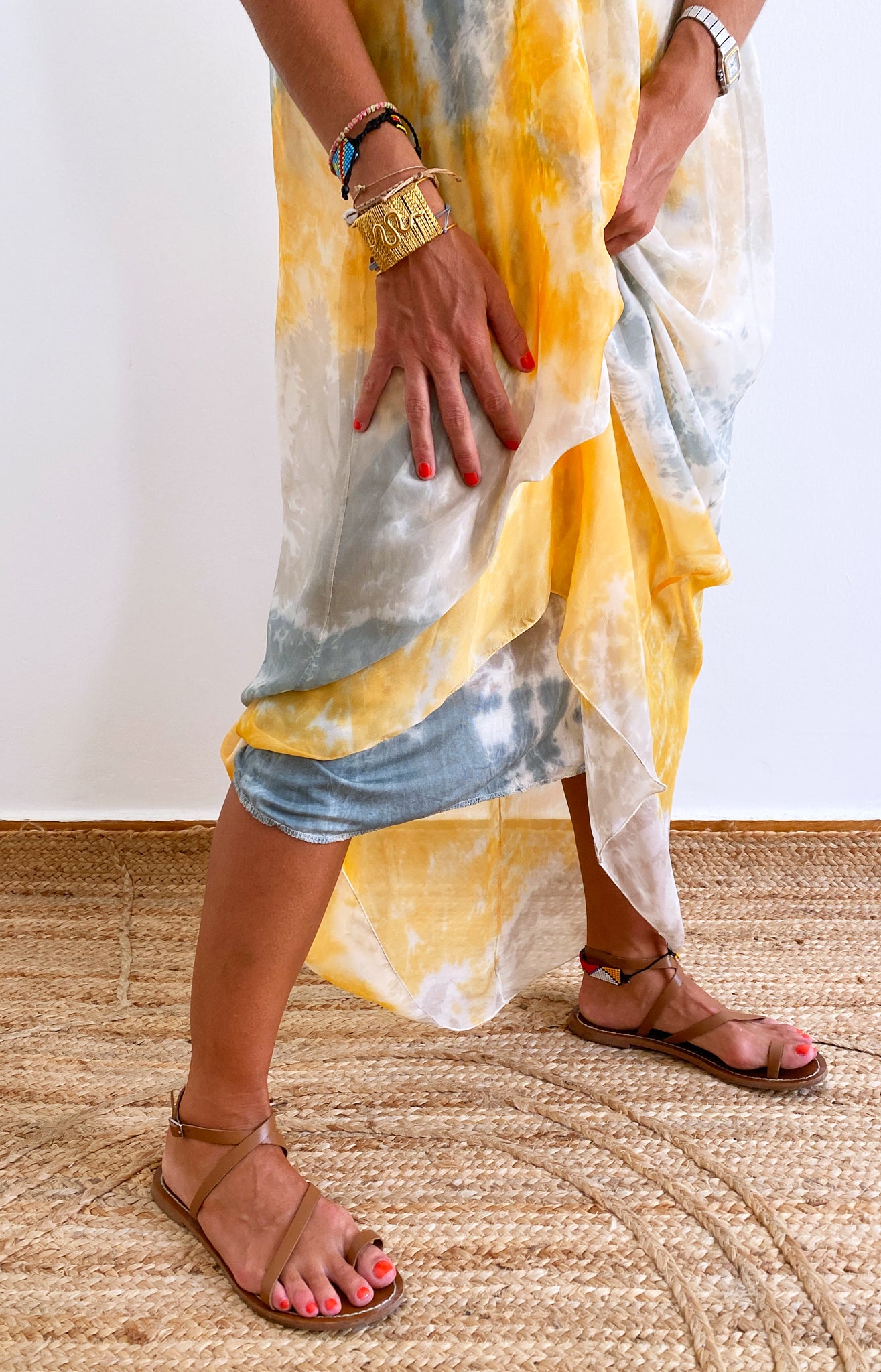 Elegantly crafted and specially dyed in Italy, Hydra dress is part of our SENSES limited edition Collection. Made with a blend of silk - viscose fabric and cut in a wide silhouette, this dress brings a soft and romantic movement imitating the island summer breeze. The tie dye colour combination will bring a unique allure for a sophisticated all day summer look. Style it with hight wedge espadrilles for a night out, or with flat sandals for the day.